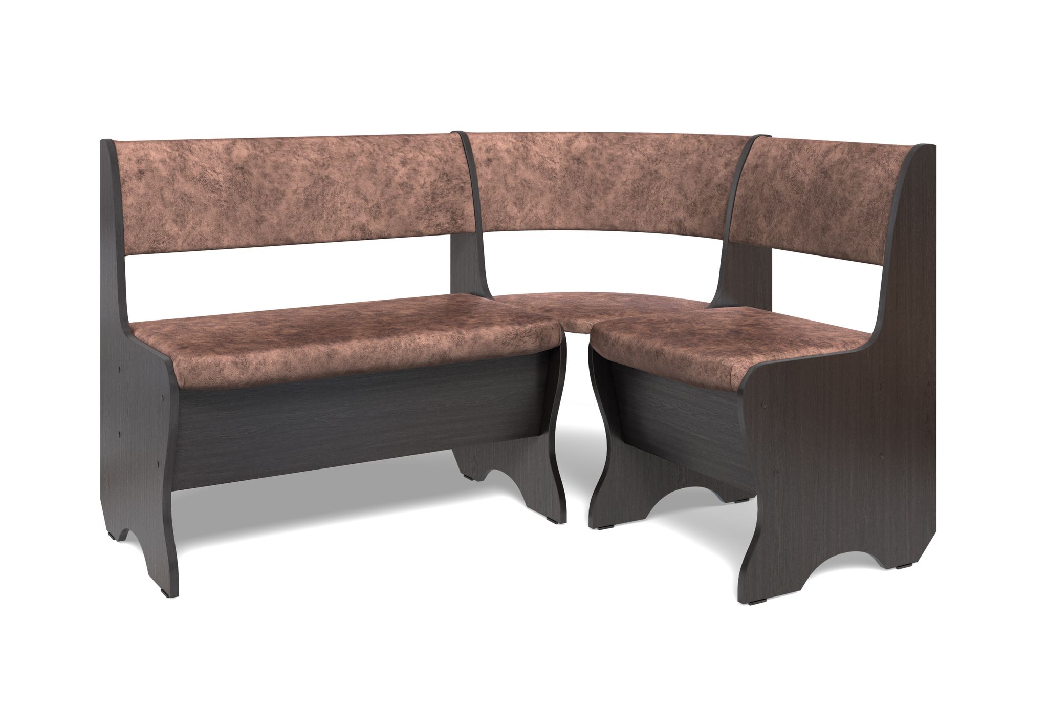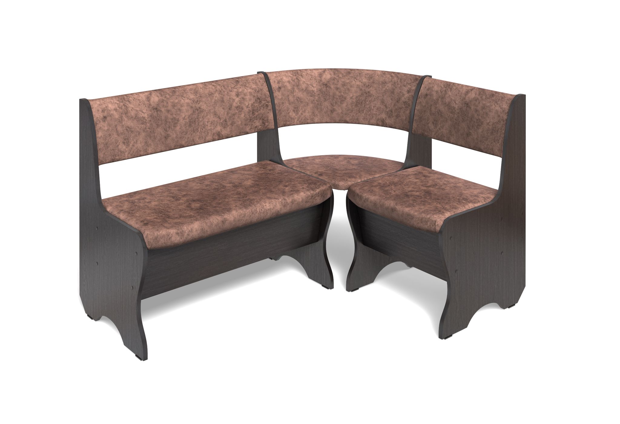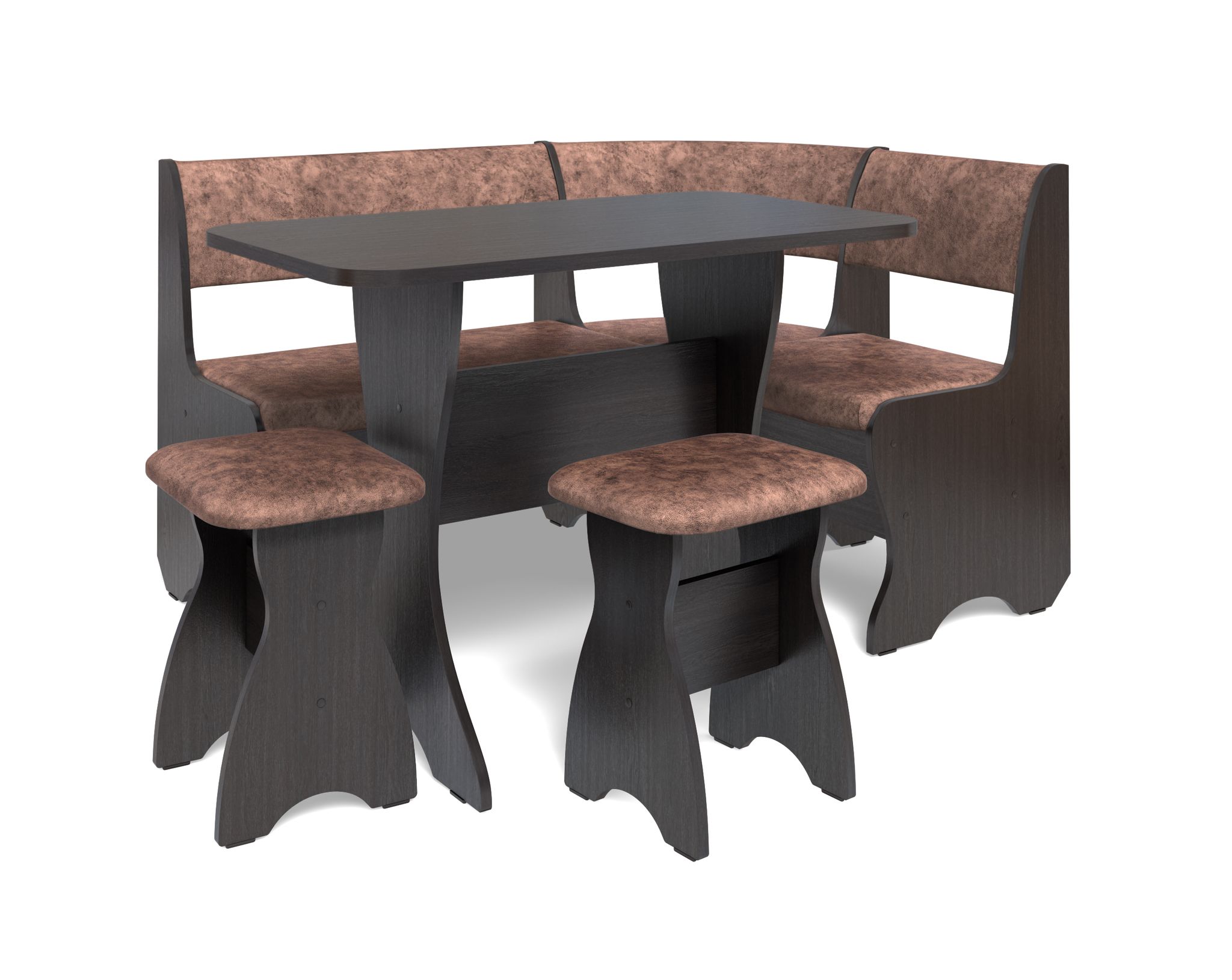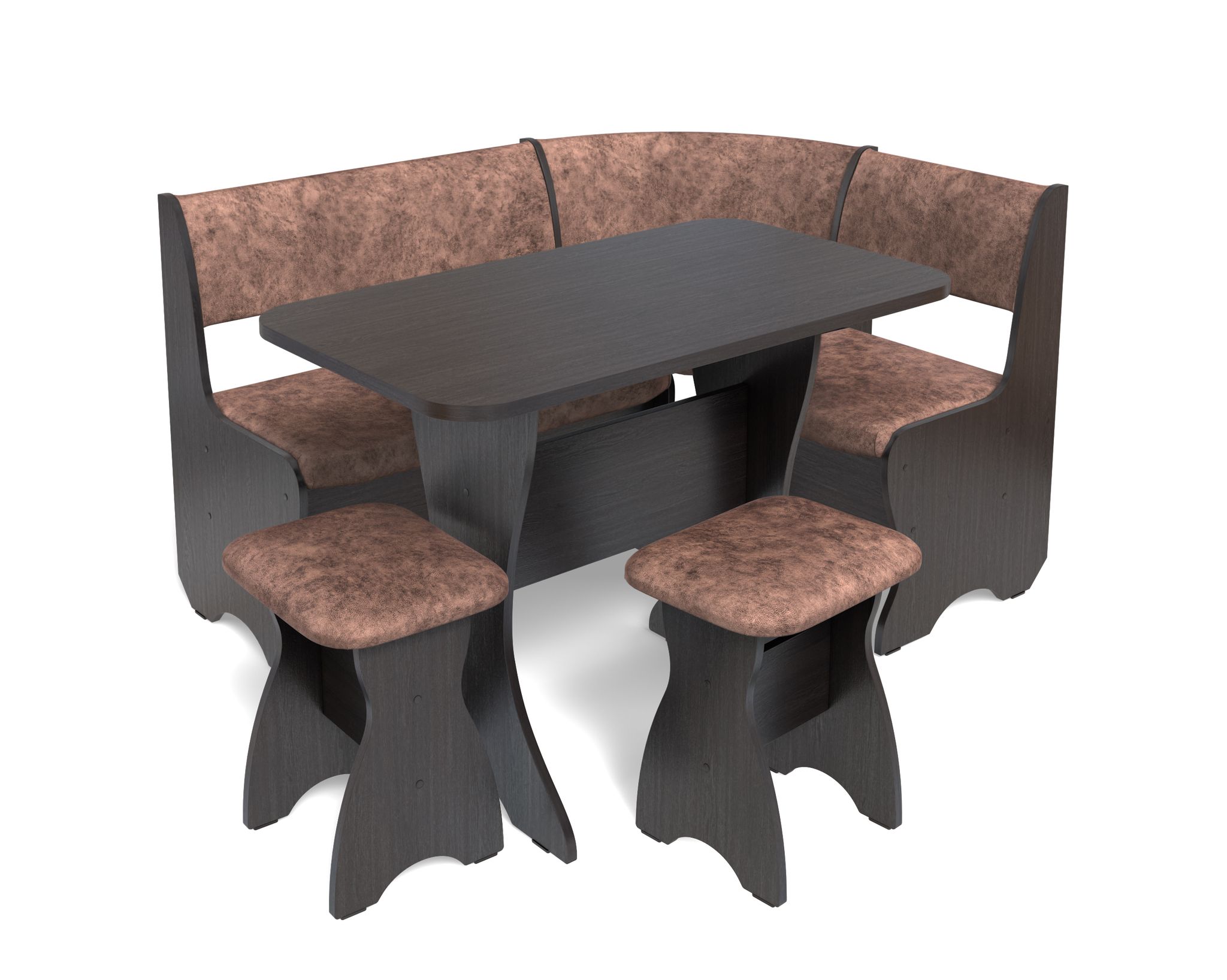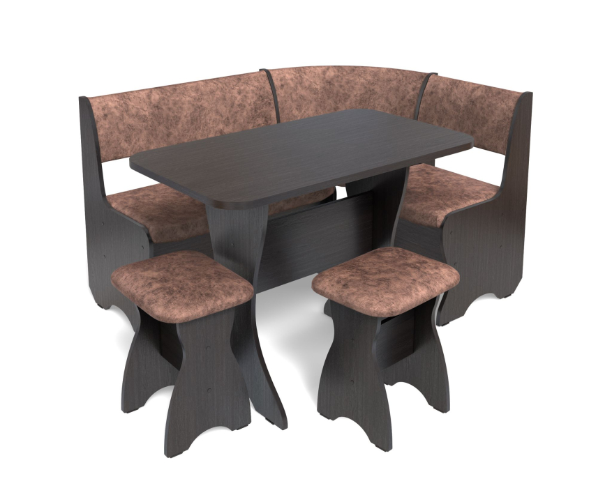 Набор мебели для кухни включающий в себя угловую скамью, стол и два табурета.