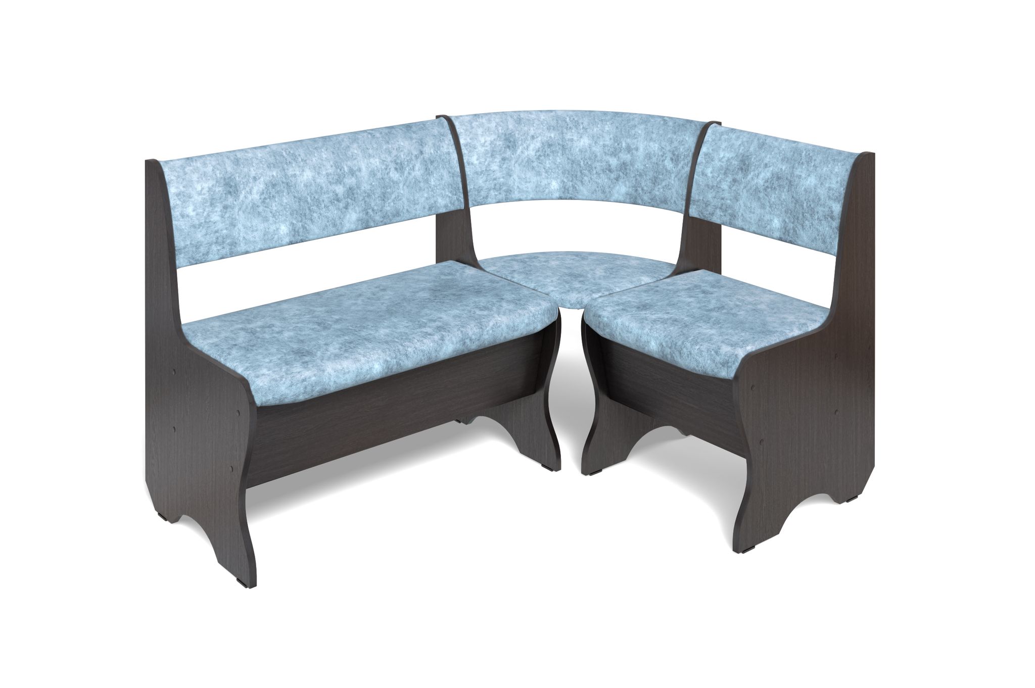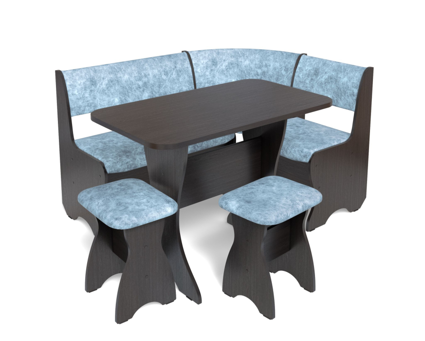 Набор мебели для кухни включающий в себя угловую скамью, стол и два табурета.