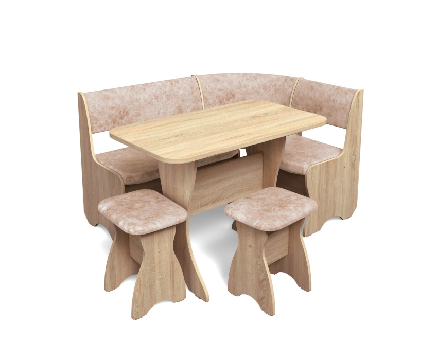 Набор мебели для кухни включающий в себя угловую скамью, стол и два табурета.