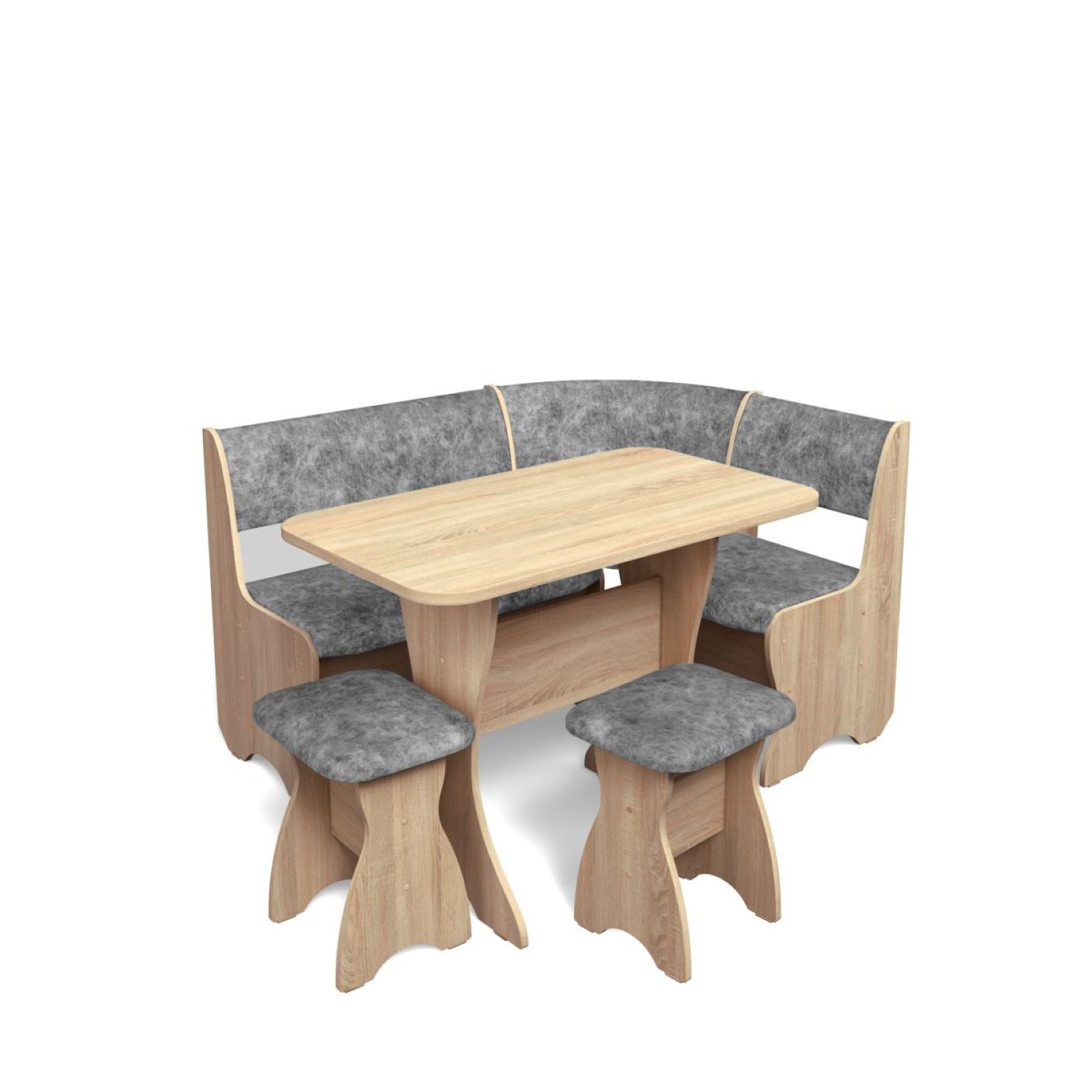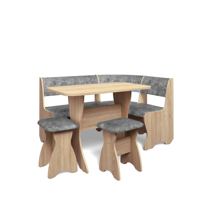 Набор мебели для кухни включающий в себя угловую скамью, стол и два табурета.