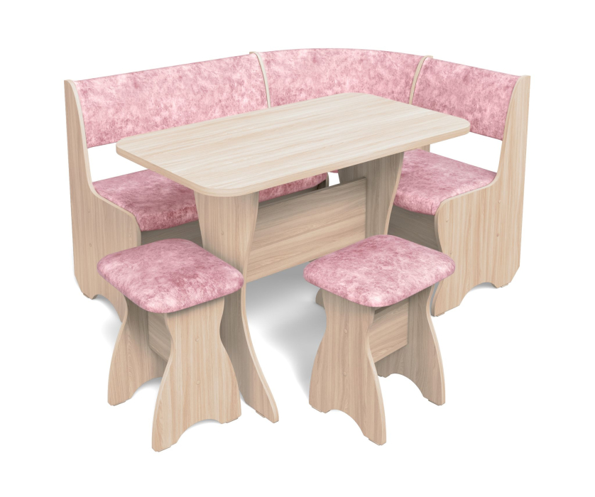 Набор мебели для кухни включающий в себя угловую скамью, стол и два табурета.