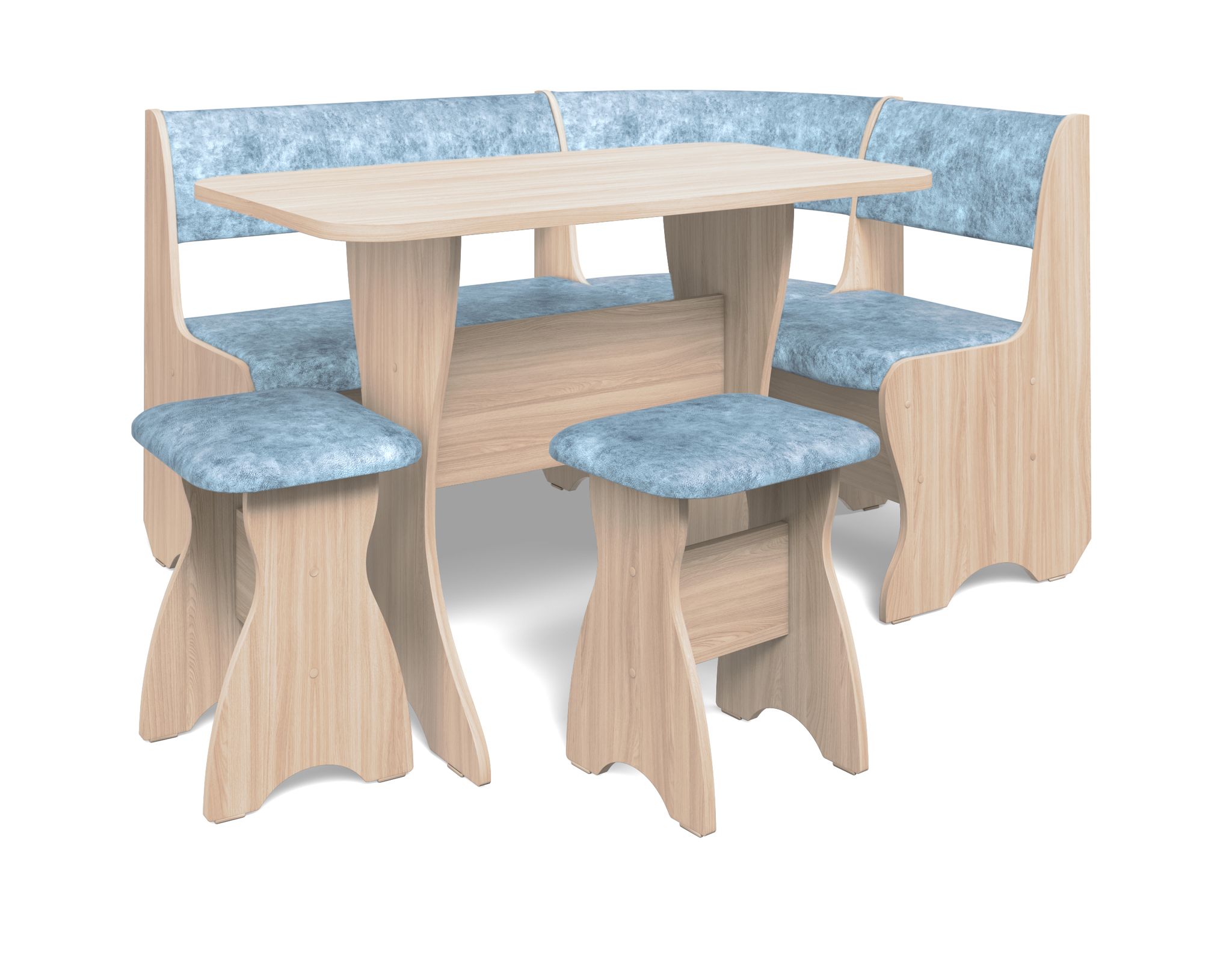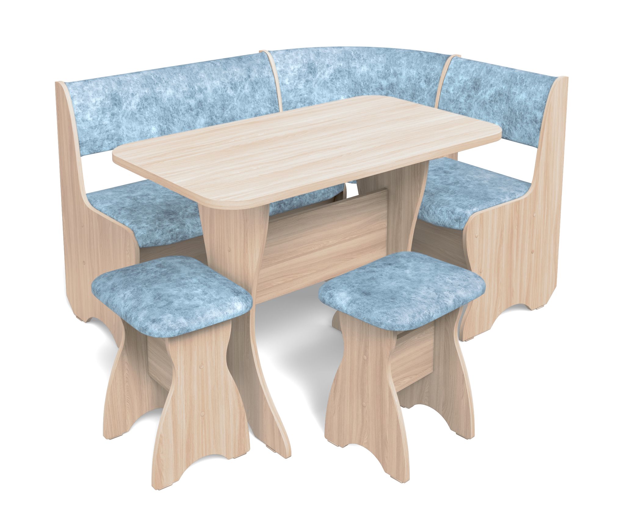 Набор мебели для кухни включающий в себя угловую скамью, стол и два табурета.