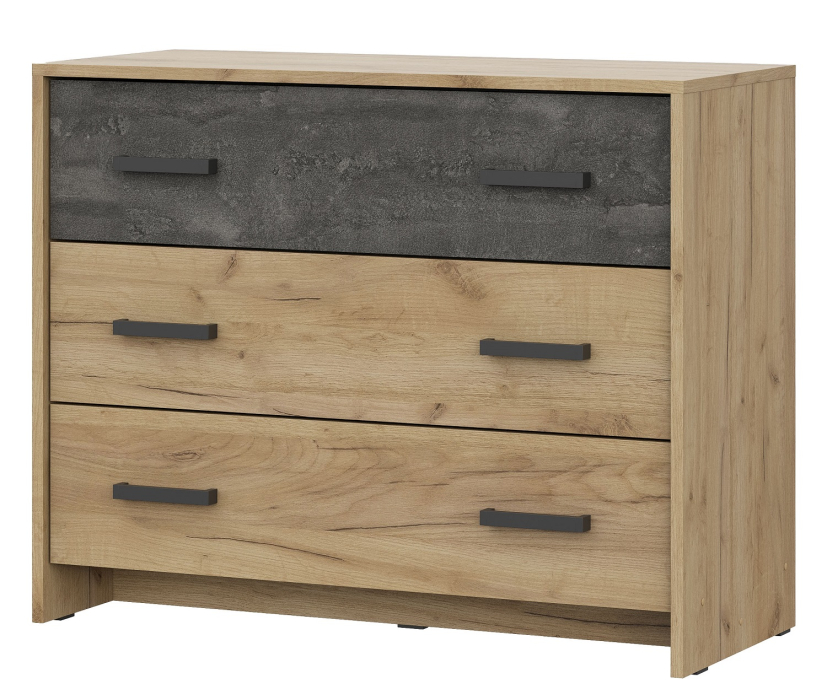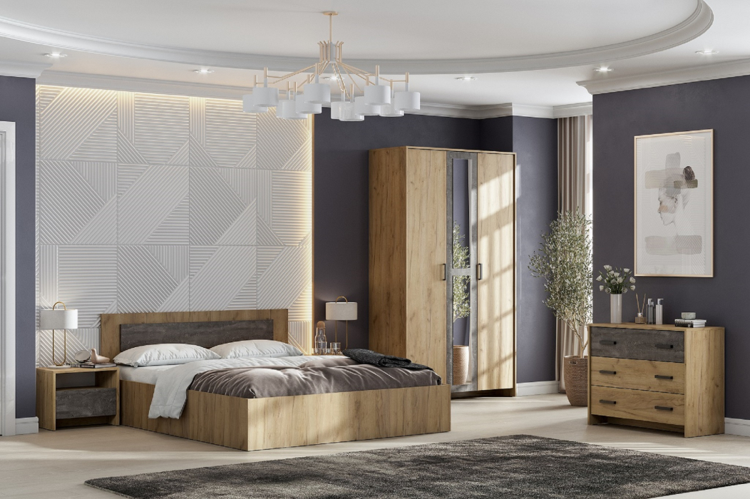 В комплектацию входит: кровать с настилом ДСП 140*200 (матрас приобретается отдельно), шкаф трехстворчатый для одежды (Ш/Г/В 120/50/209), комод с ящиками (Ш/Г/В 90/39/73), тумбы прикроватные * 2 шт (Ш/Г/В 50/36/41).