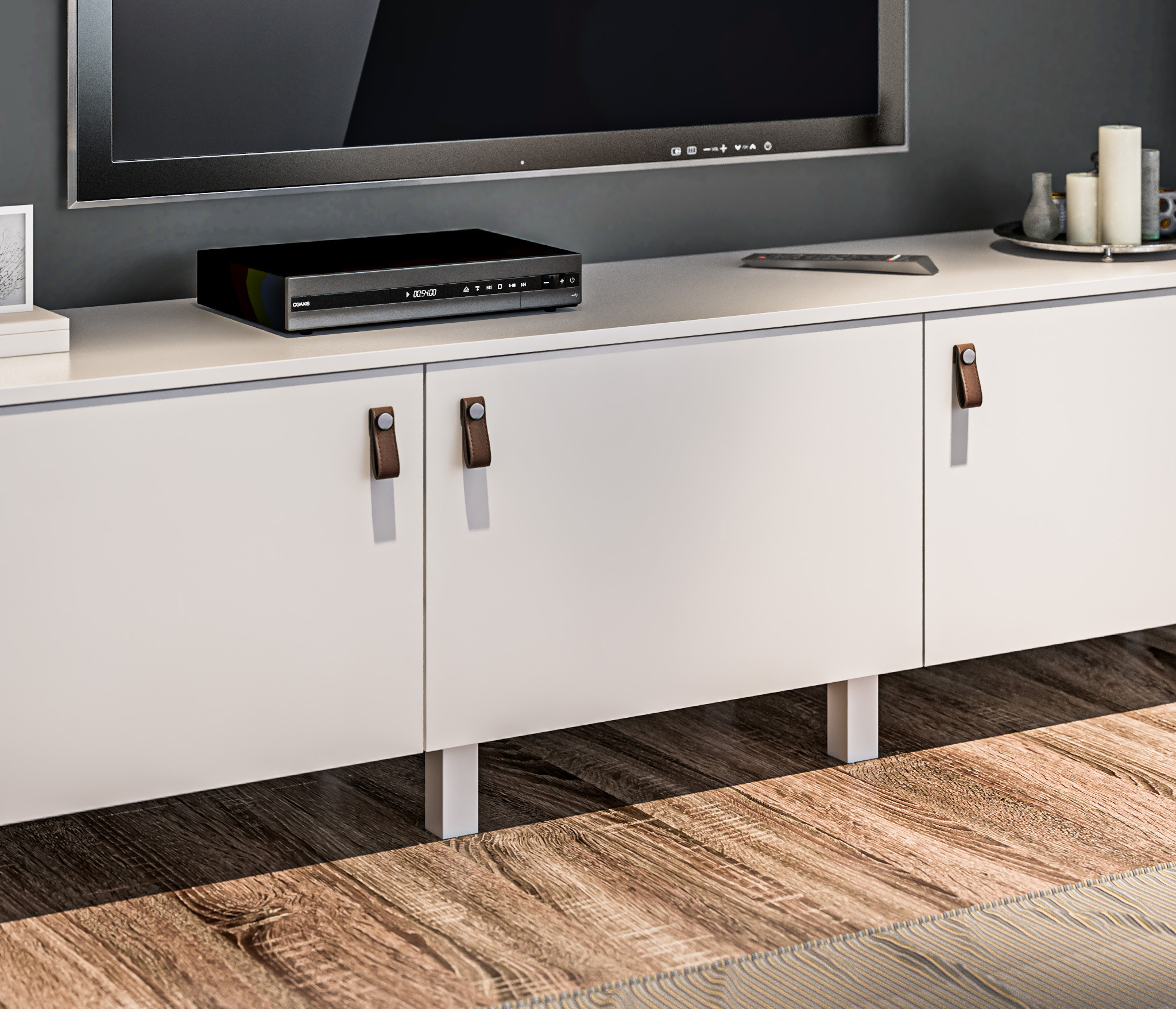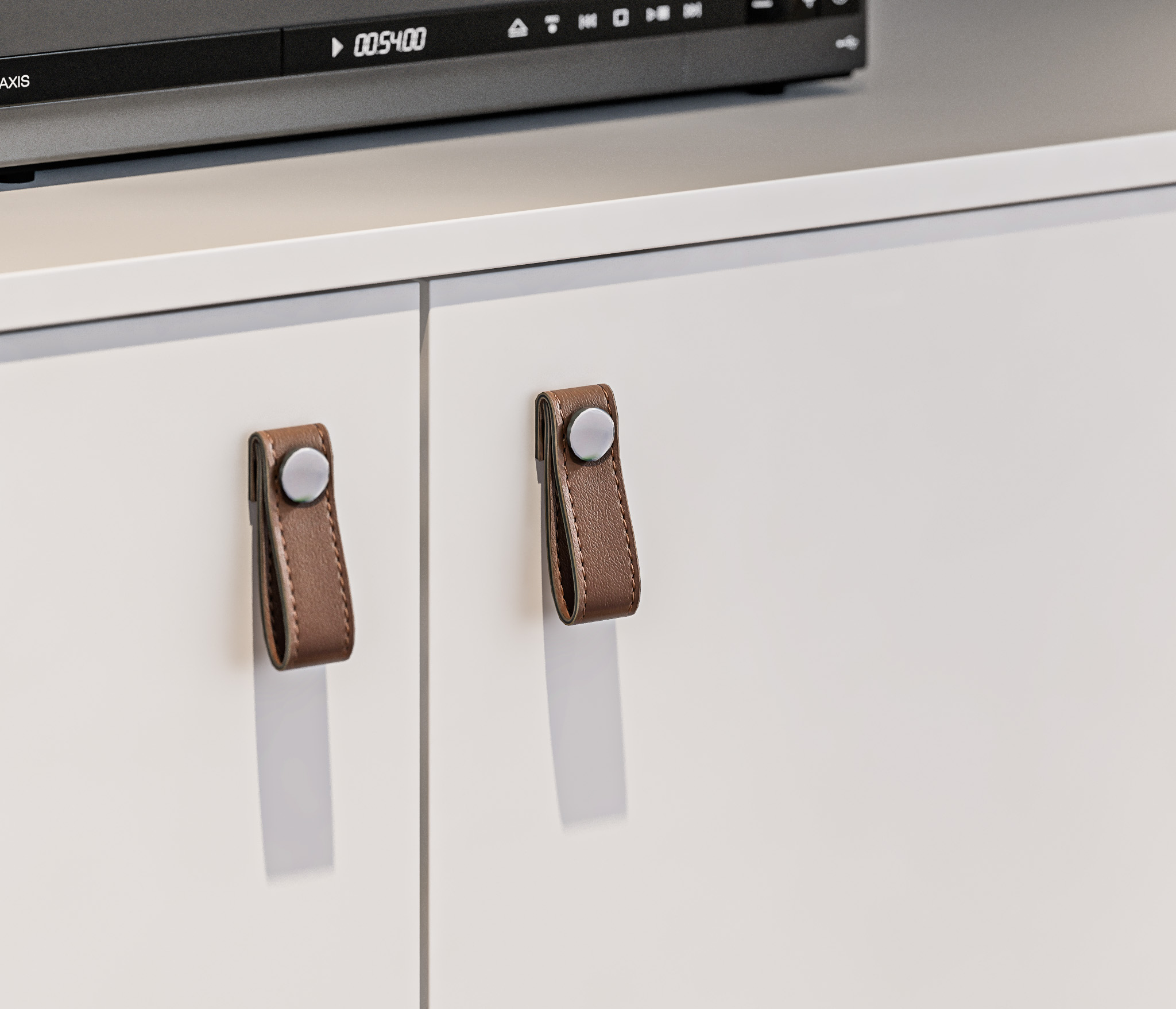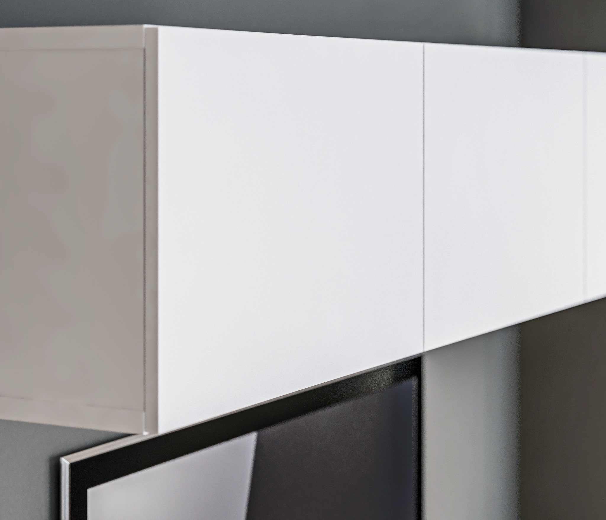 Выбор ручек является дополнительной опцией. В данной гостиной представлена ручка-кнопка в цвете хром/капучино для тумбы под телевизор, верхняя полка оснащена механизмом Push To Open, который позволяет открывать ее легким нажатием.