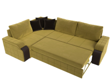 Механизм: дельфин. Он конструктивно сложен. Состоит из направляющих, металлических кронштейнов и роликов. Разложить угловой диван можно потянув за скрытую петлю. Нижний короб выдвигается вперед, спальный блок поднимается.
