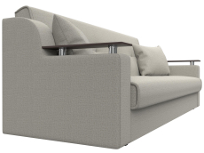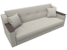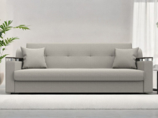 Сенатор – мягкий прямой диван с эргономичной спинкой и мини-столиками по бокам. Он устойчиво стоит на 4 пластиковых ножках, идеально гармонирующих с общим дизайном. Спинка прямая, без съемных подушек, подлокотники деревянные, выполняют роль столиков. Классический механизм «книжка» позволяет быстро трансформировать его в удобную двуспальную кровать.