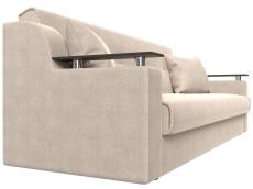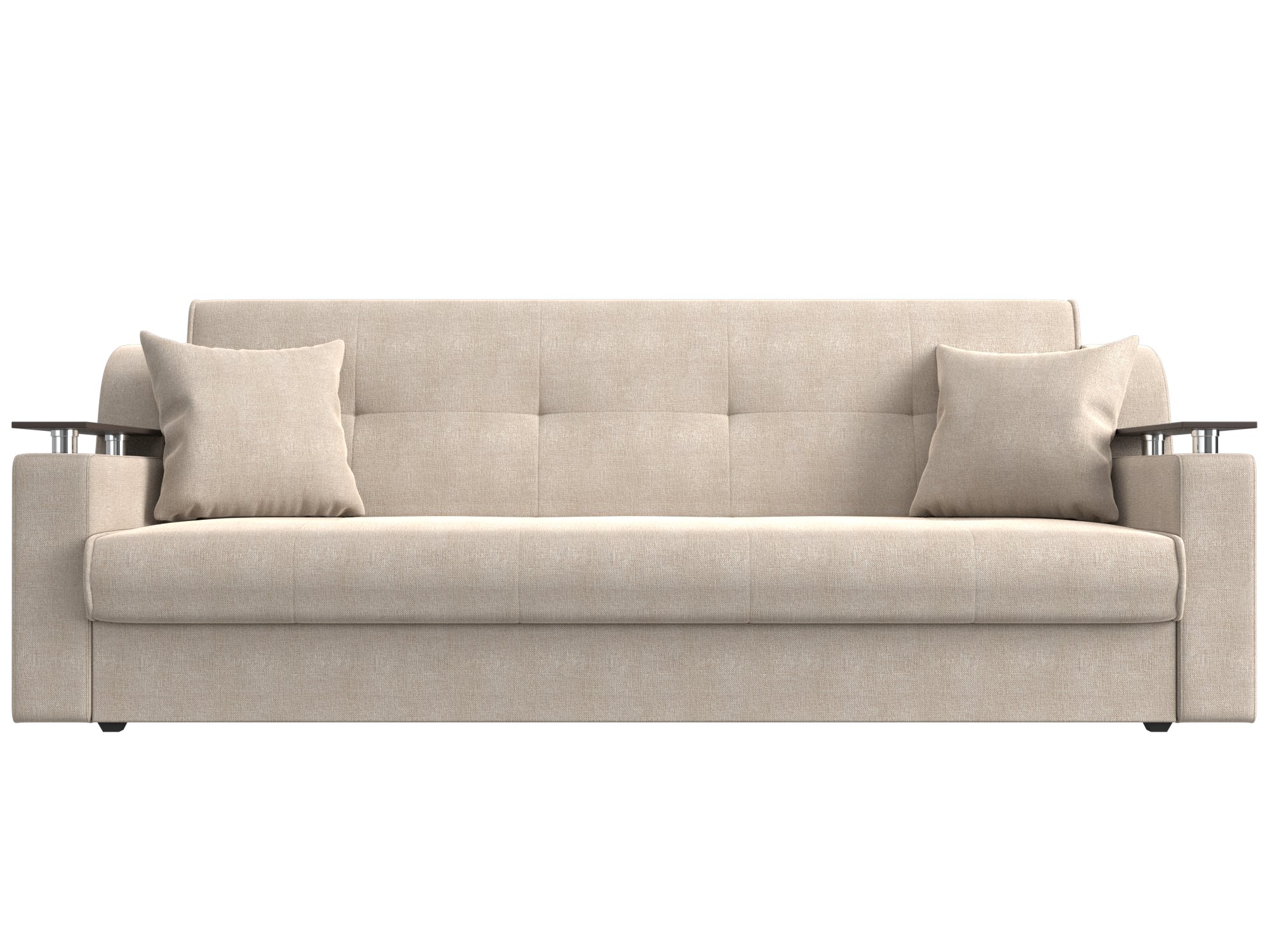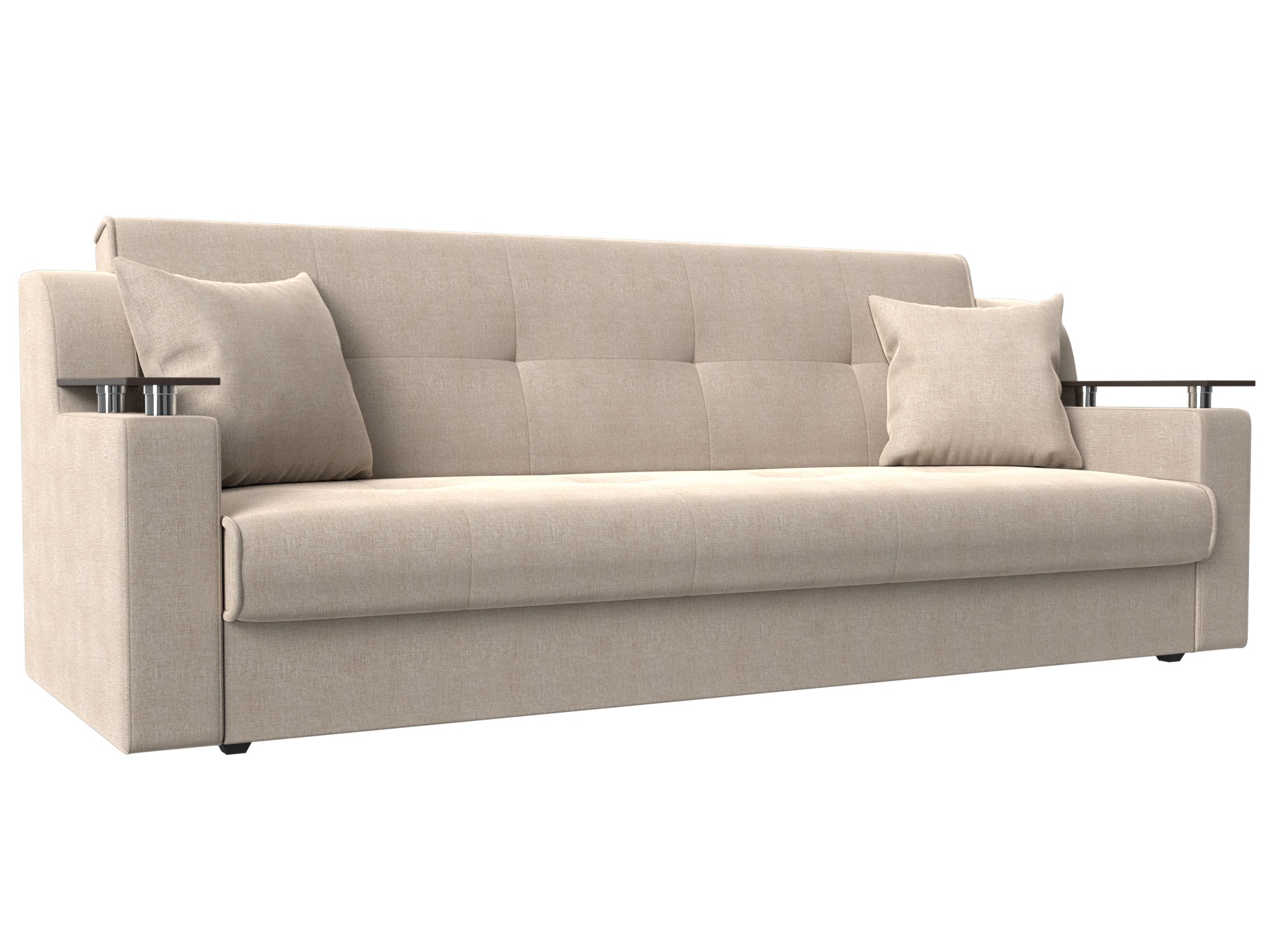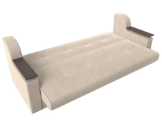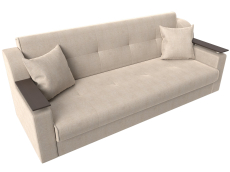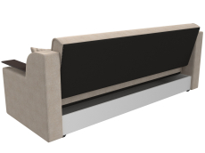 Сенатор – мягкий прямой диван с эргономичной спинкой и мини-столиками по бокам. Он устойчиво стоит на 4 пластиковых ножках, идеально гармонирующих с общим дизайном. Спинка прямая, без съемных подушек, подлокотники деревянные, выполняют роль столиков. Классический механизм «книжка» позволяет быстро трансформировать его в удобную двуспальную кровать.