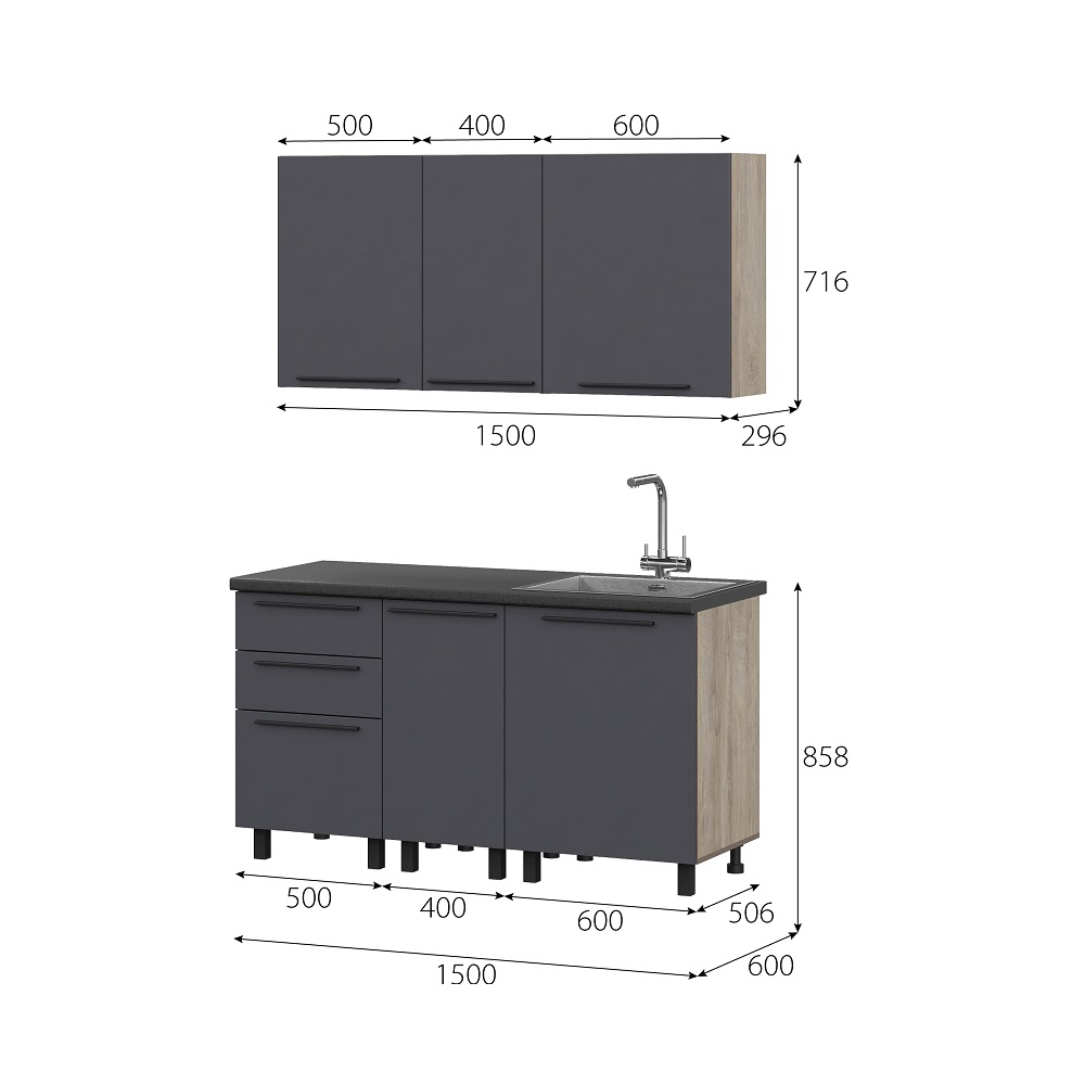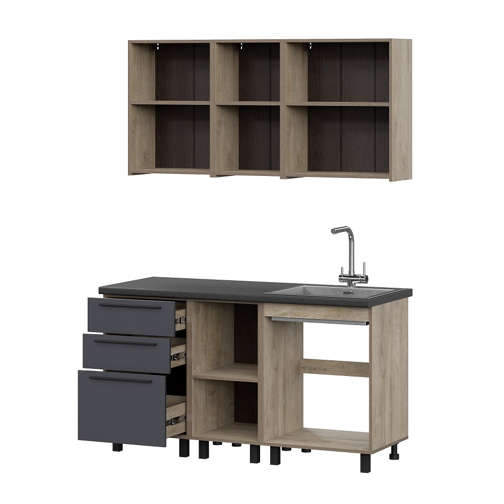 Модульная кухня Этна Софт Графит выполнена в современном стиле и сочетает в себе глубокий темно-серый оттенок фасадов и древесный декор корпуса. Актуальное исполнение, продуманное наполнение шкафов, фурнитура европейского качества и возможность создать уникальный комплект.