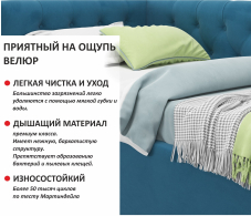 Тахта с двумя мягкими спинками выполнена из модной мебельной ткани – велюр. Это уникальный материал, который получается за счет сплетения пяти волокон одновременно. Ткань износостойкая, легко чиститься от загрязнений, практичная, эластичная, устойчивая к ультрафиолету.