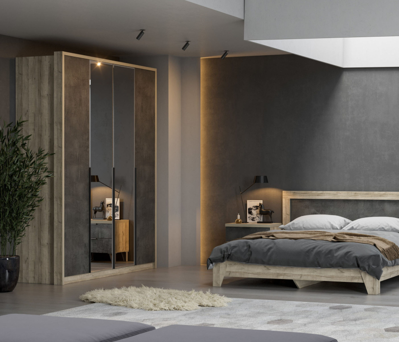 Шкаф ШК-3206 Анима – четырёхстворчатый шкаф из комплекта модульной спальни Анима, самый вместительный. Эта модель оснащена двойным высоким зеркалом на двух средних дверцах. Современный дизайн в стиле Лофт украшен природными расцветками дерева и камня.