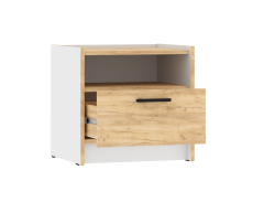 Тумба оснащается выдвижным ящиком. Конструкцией предусмотрена открытая полка.