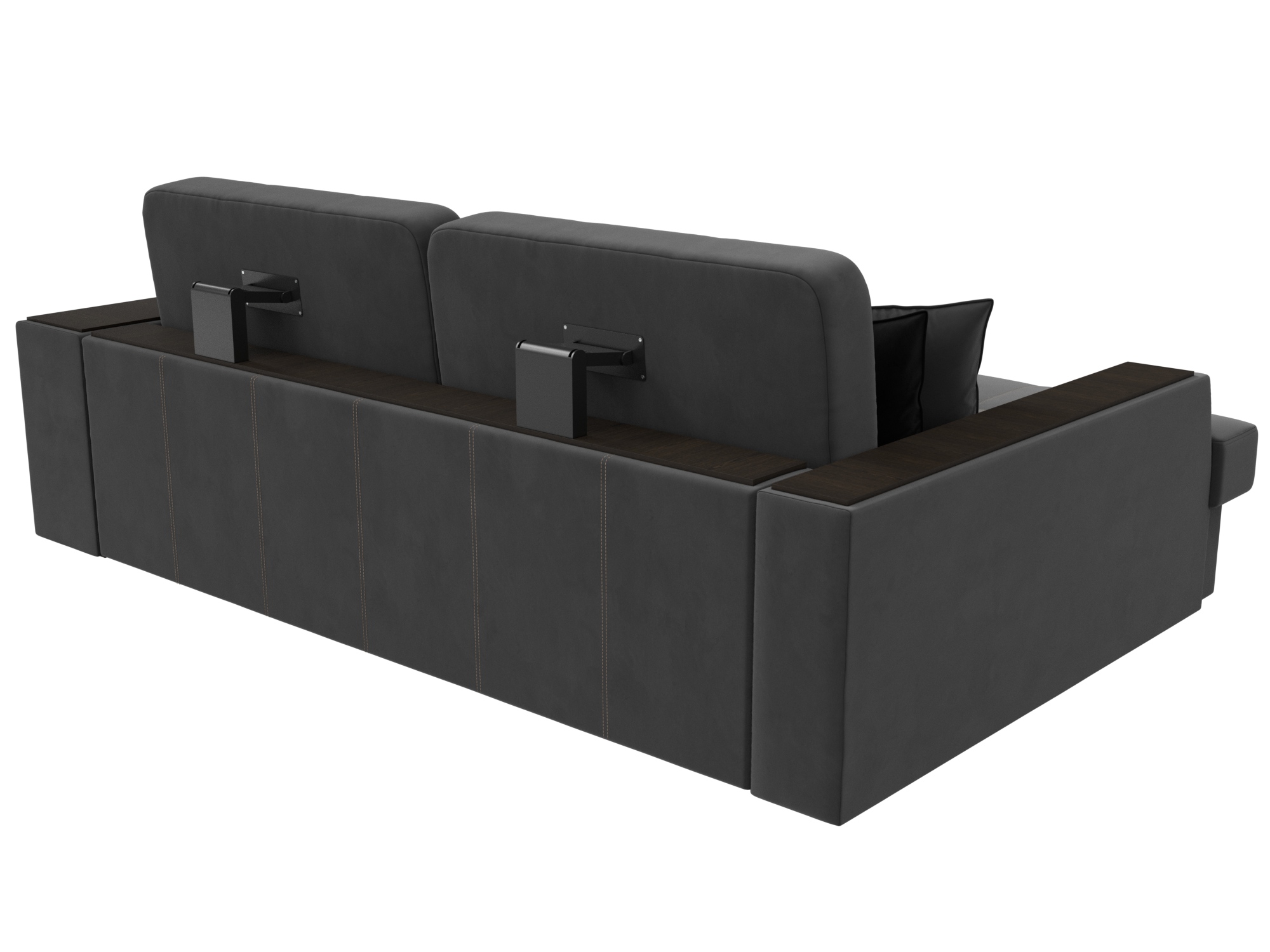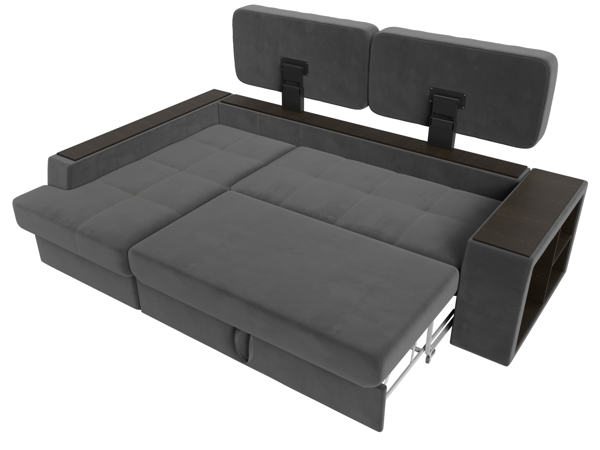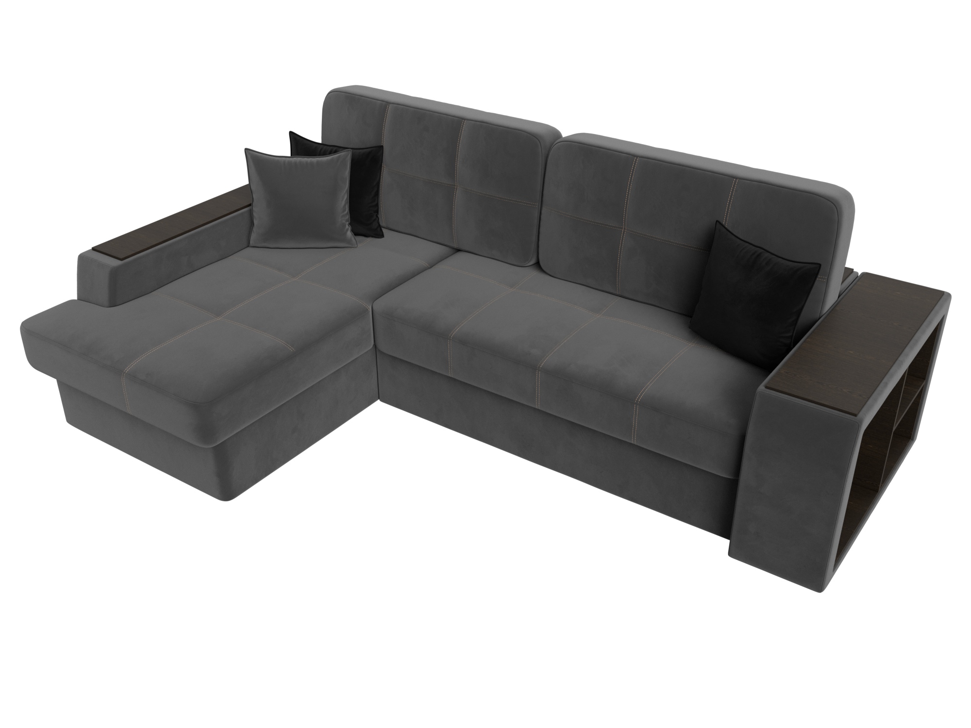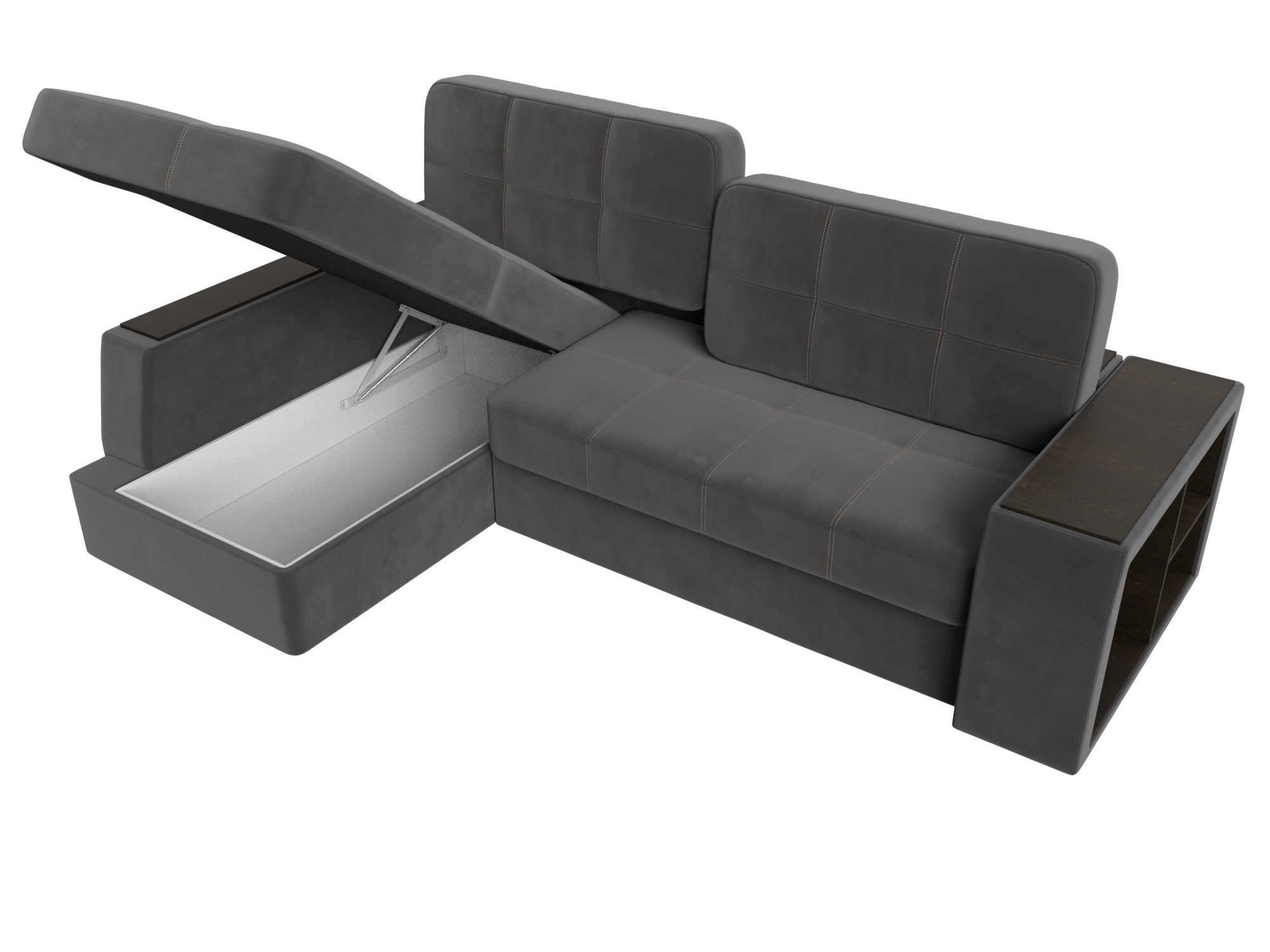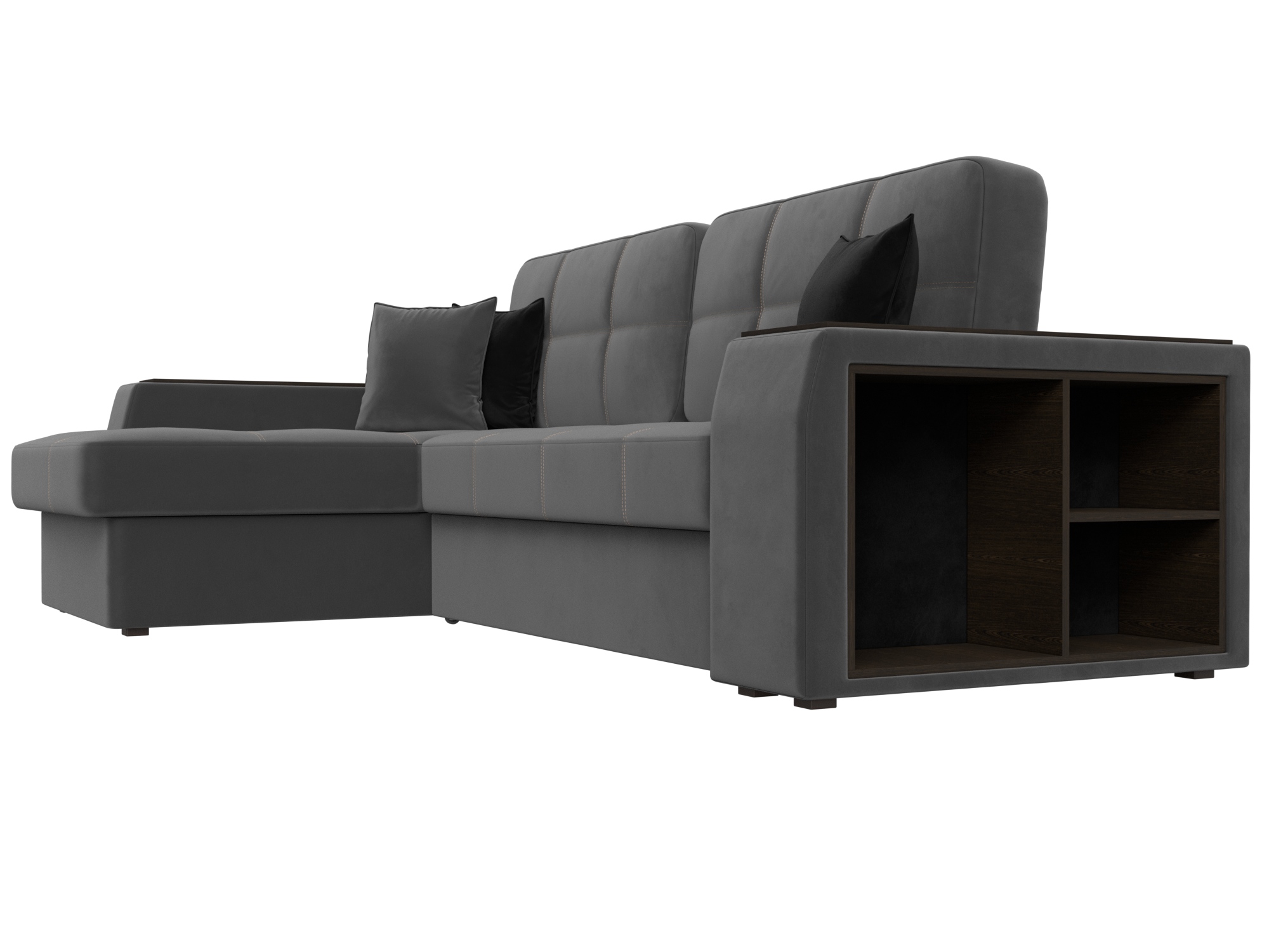 Шикарный угловой диван Брюссель удобен и функционален в использовании. Подлокотники выполняют роль мини-столиков. Одна из боковин дополнена книжными полками, декорированным «под дерево». Под длинной боковиной расположена ниша для белья. Изделие оснащено удобным механизмом трансформации в двуспальную кровать.
