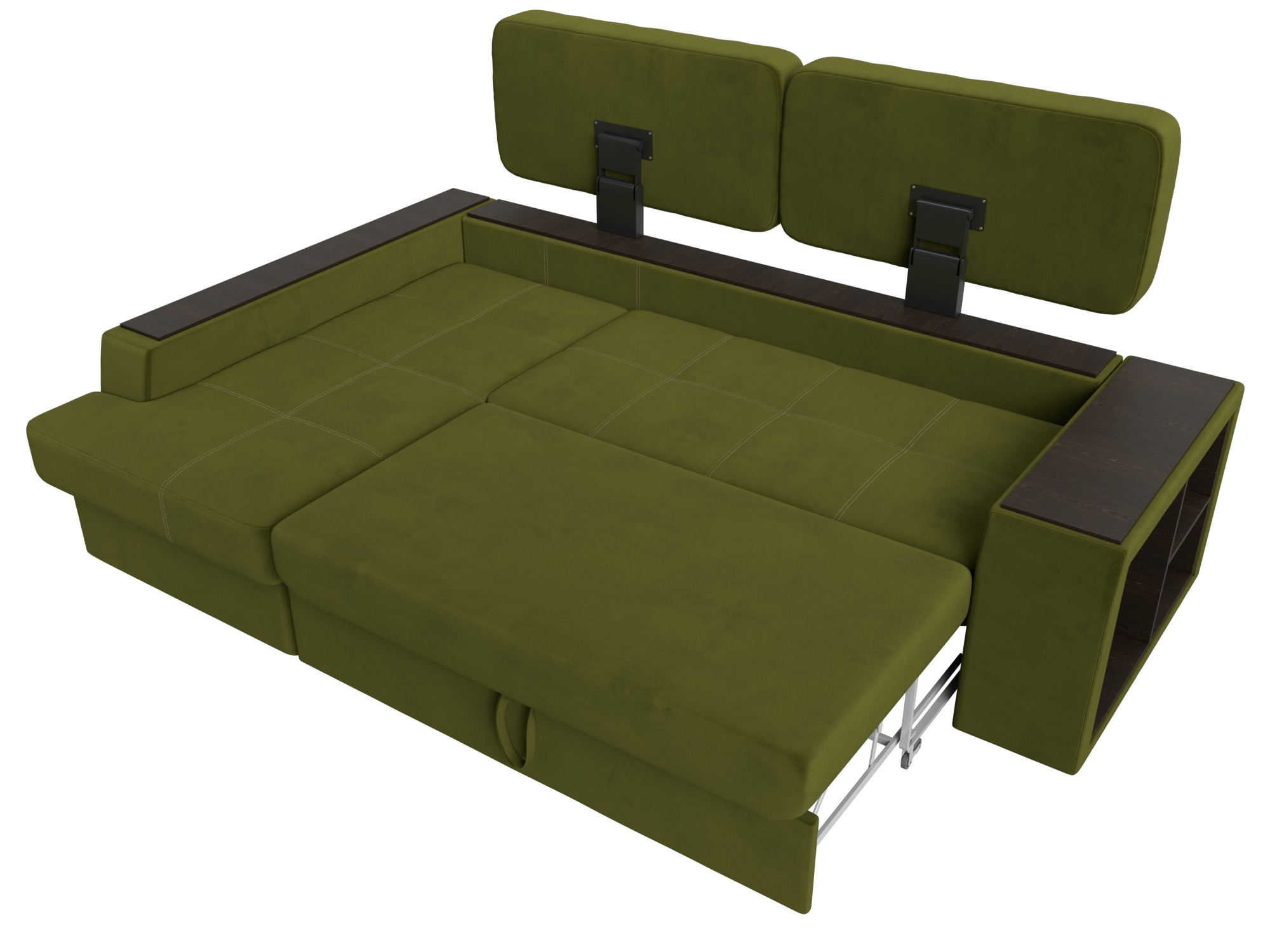 Шикарный угловой диван Брюссель удобен и функционален в использовании. Подлокотники выполняют роль мини-столиков. Одна из боковин дополнена книжными полками, декорированным «под дерево». Под длинной боковиной расположена ниша для белья. Изделие оснащено удобным механизмом трансформации в двуспальную кровать.