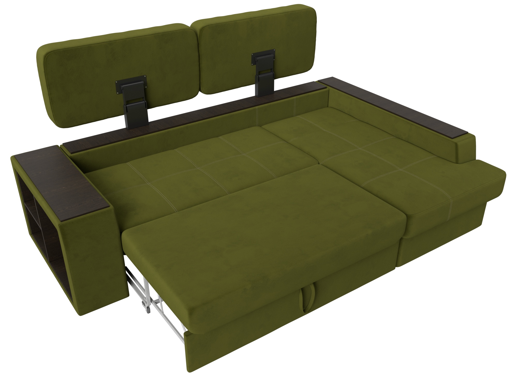 Шикарный угловой диван Брюссель удобен и функционален в использовании. Подлокотники выполняют роль мини-столиков. Одна из боковин дополнена книжными полками, декорированным «под дерево». Под длинной боковиной расположена ниша для белья. Изделие оснащено удобным механизмом трансформации в двуспальную кровать.