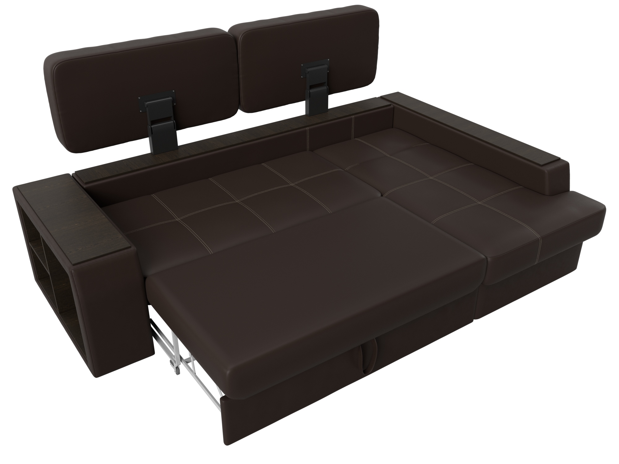 Шикарный угловой диван Брюссель удобен и функционален в использовании. Подлокотники выполняют роль мини-столиков. Одна из боковин дополнена книжными полками, декорированным «под дерево». Под длинной боковиной расположена ниша для белья. Изделие оснащено удобным механизмом трансформации в двуспальную кровать.