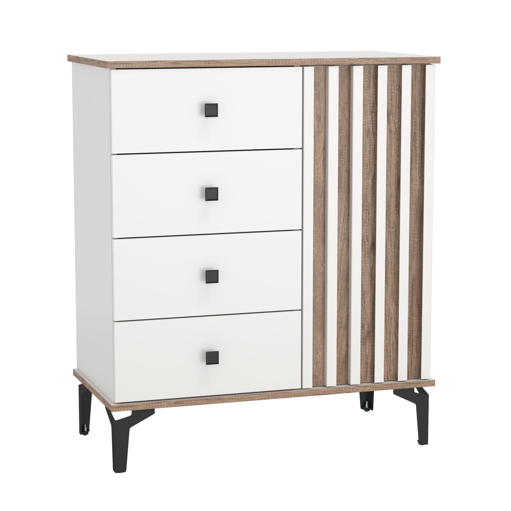 Вместительный комод из серии Либерти с 4-мя выдвижными ящиками и распашной дверцей. Изделие установлено на высокие металлические ножки.