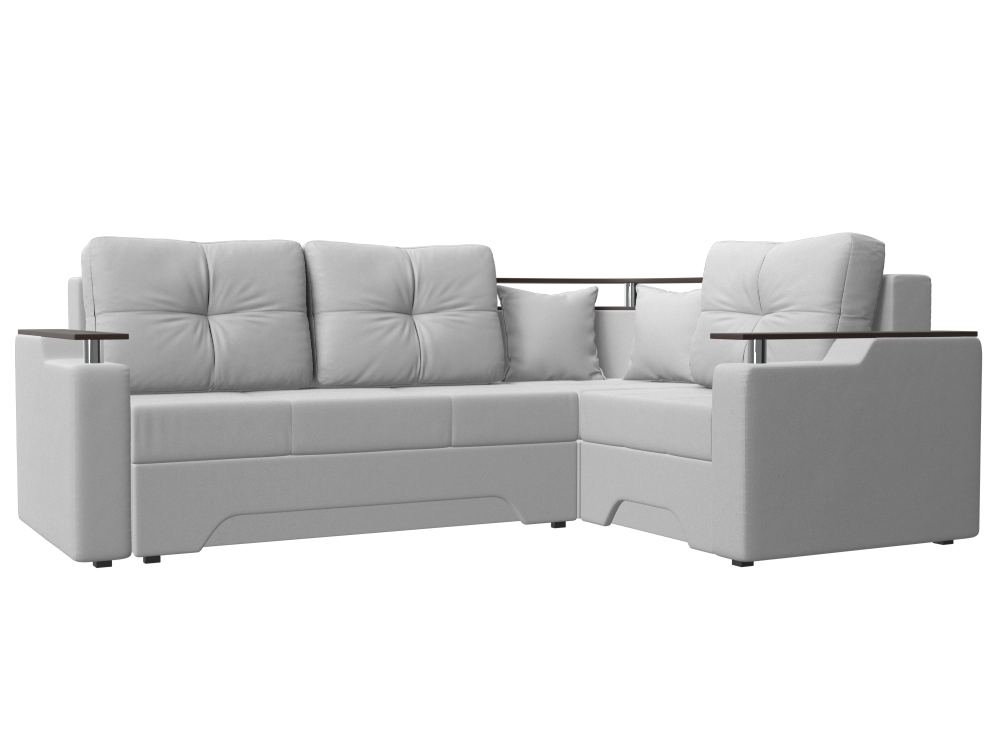 Угловой диван-кровать «Комфорт» универсален и подойдет для большинства современных интерьеров: лофт, модерн, хай-тек, прованс. Мягкие большие подушки декорированы цветным кантом придают модели уют и элегантность, а в углу расположена деревянная столешница для интерьерного декора. Подлокотники выполнены в виде мини-столиков на металлических стойках, что позволяют поставить чашку чая для комфортного просмотра телепередач.