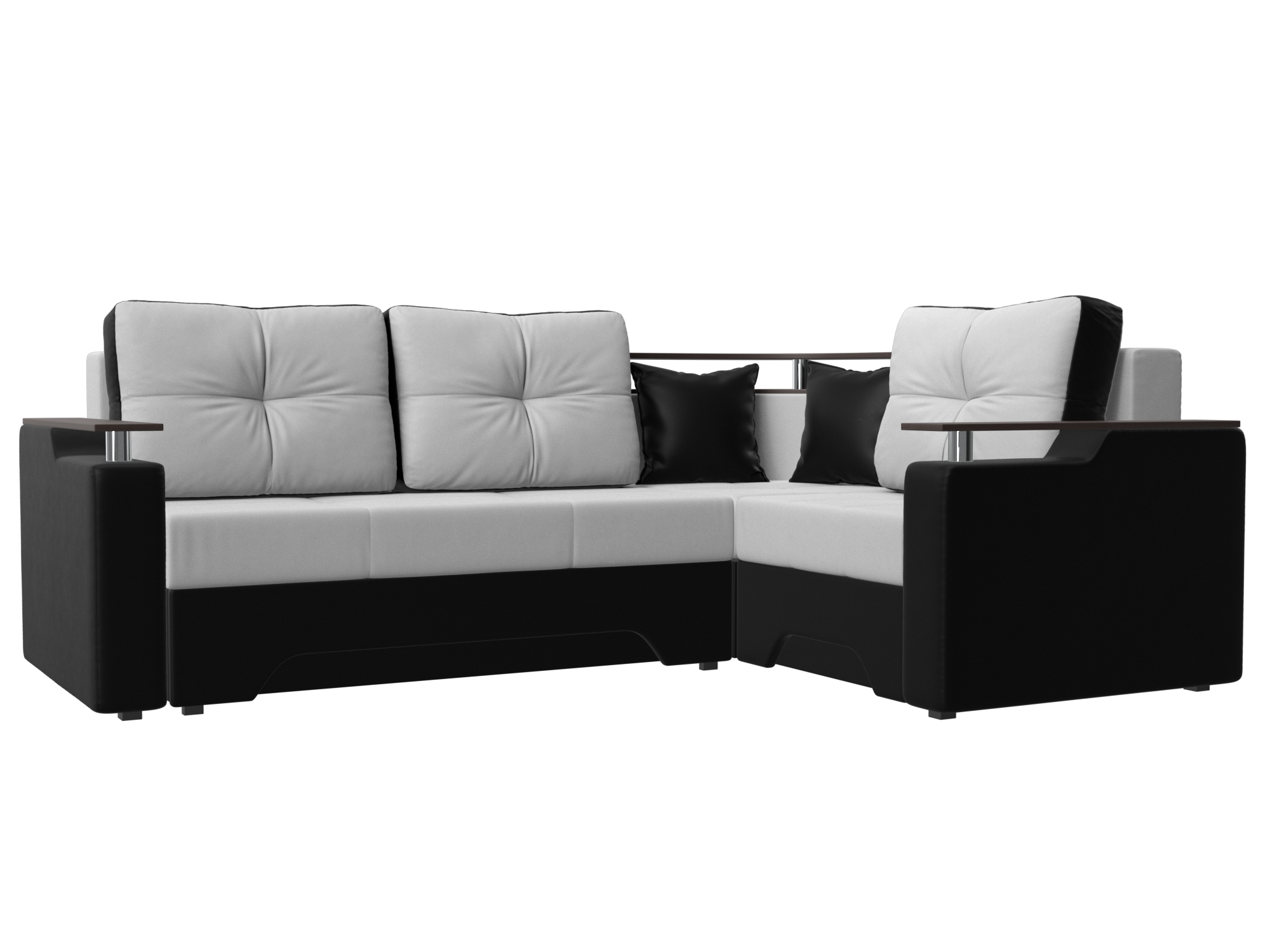 Угловой диван-кровать «Комфорт» универсален и подойдет для большинства современных интерьеров: лофт, модерн, хай-тек, прованс. Мягкие большие подушки декорированы цветным кантом придают модели уют и элегантность, а в углу расположена деревянная столешница для интерьерного декора. Подлокотники выполнены в виде мини-столиков на металлических стойках, что позволяют поставить чашку чая для комфортного просмотра телепередач.