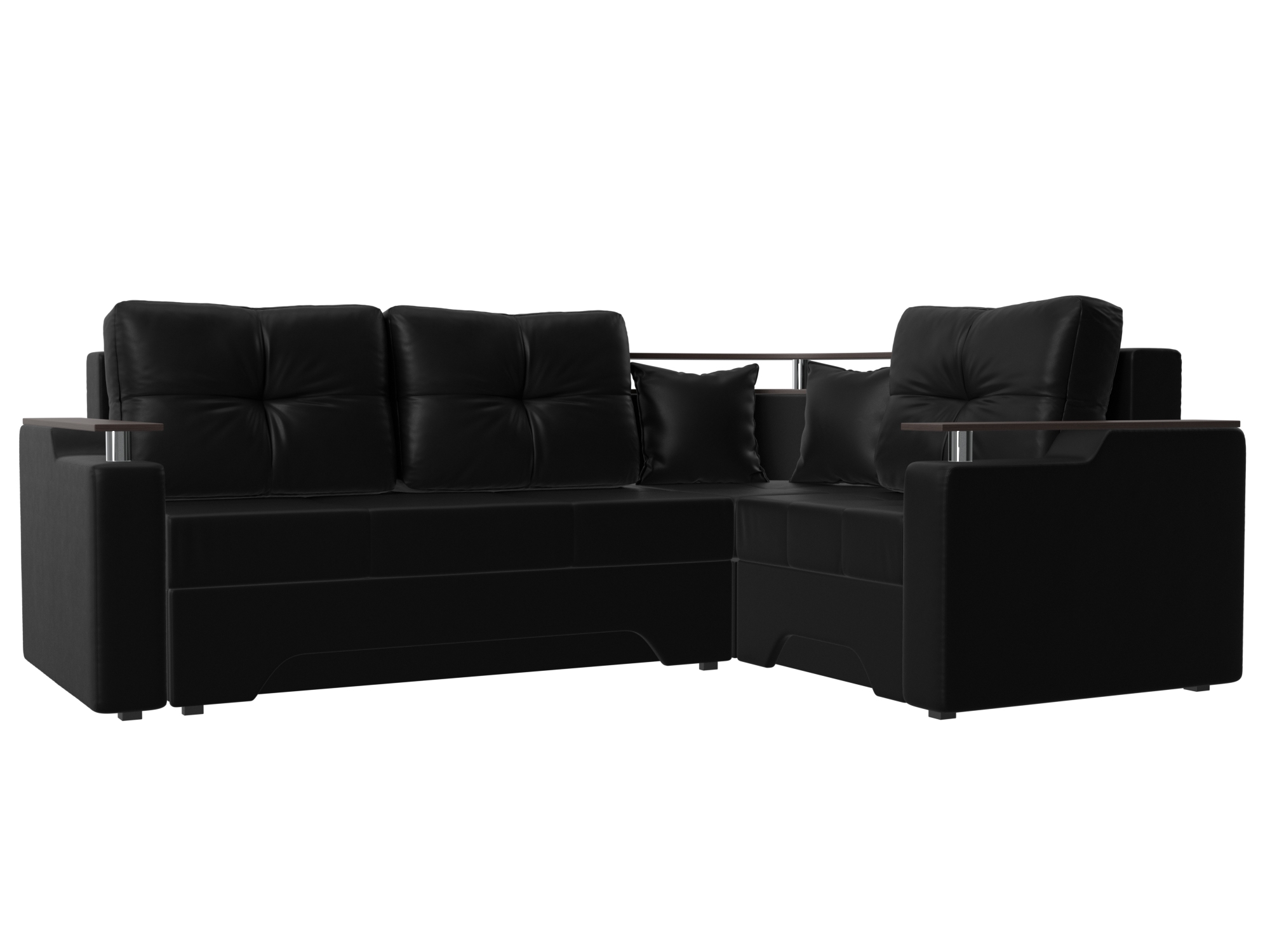 Угловой диван-кровать «Комфорт» универсален и подойдет для большинства современных интерьеров: лофт, модерн, хай-тек, прованс. Мягкие большие подушки декорированы цветным кантом придают модели уют и элегантность, а в углу расположена деревянная столешница для интерьерного декора. Подлокотники выполнены в виде мини-столиков на металлических стойках, что позволяют поставить чашку чая для комфортного просмотра телепередач.