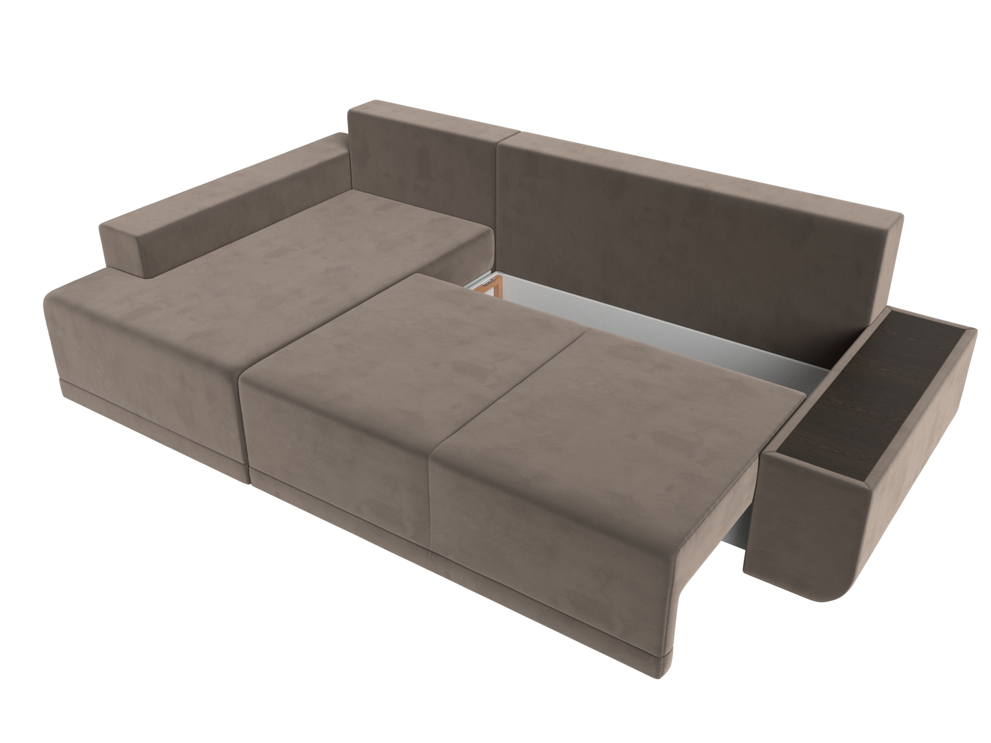 Механизм раскладки: еврокнижка. Выдвиньте вперед сиденье углового дивана, сложив спинку в открывшуюся нишу. Данная система простая с точки зрения эксплуатации. Она надежная, состоит из стальных кронштейнов и направляющих.