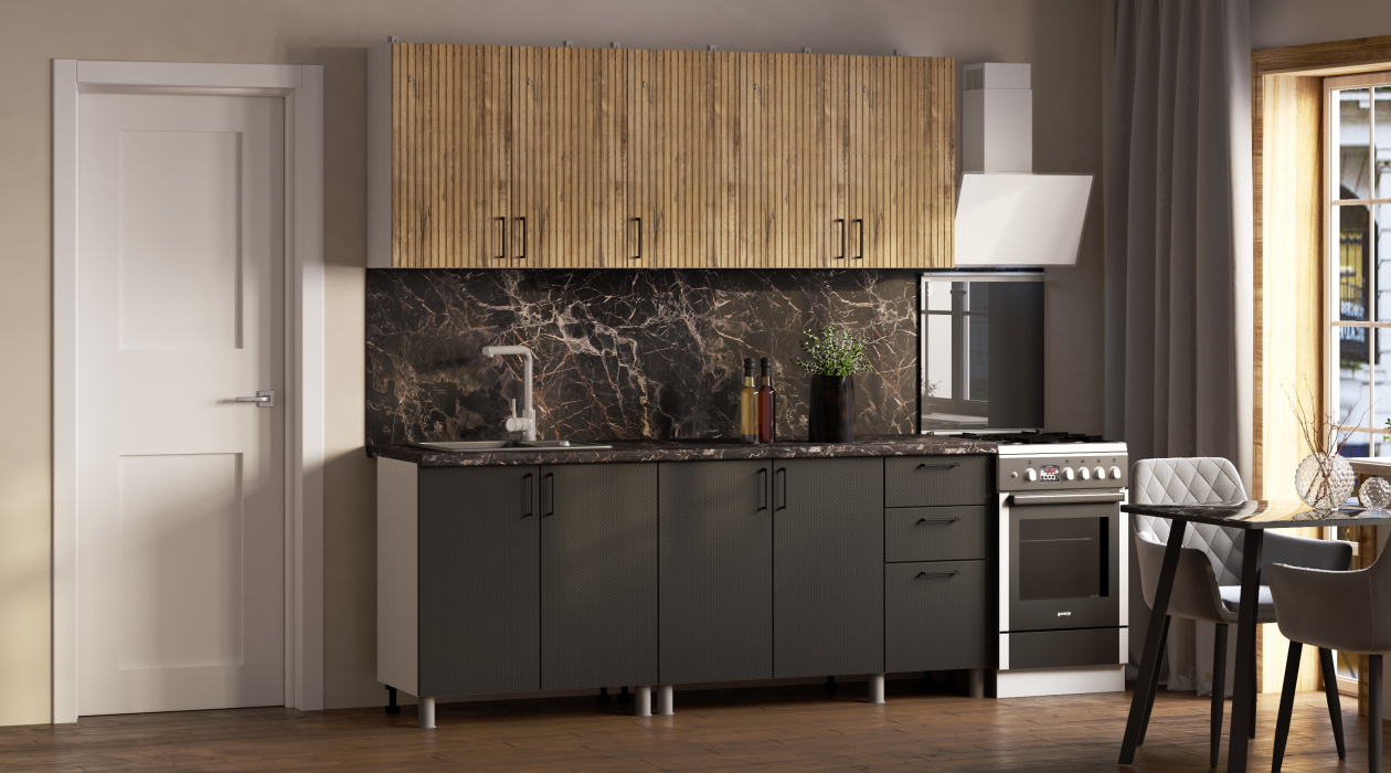 Стеновая панель, мойка, смеситель не входят в стоимость комплекта. Состав компоновки: ШВ800, ШВ1200, ШНМ800, ШН3Я1200. Глубина нижних модулей со столешницей и фасадами: 600мм. Глубина нижних модулей без столешницы и фасадов: 430мм. Высота нижних модулей без столешницы: 726мм. Высота верхних модулей: 720мм. Глубина верхних модулей: 290мм. Столешница цельная