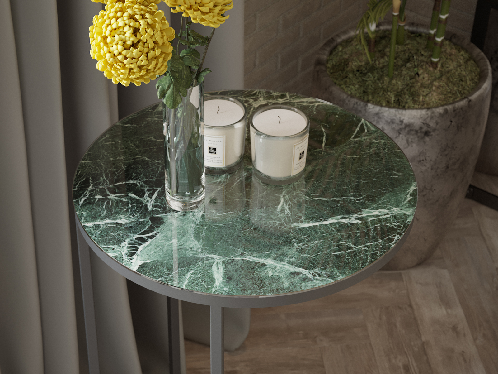 Техническая виртуозность исполнения столешницы подчеркивается яркой УФ печатью в эксклюзивных цветах, благодаря чему данная модель приобретает визуальную утонченность. Цветовая гамма столешницы из закаленного стекла с УФ печатью с точность передает природный рисунок в цвете зеленый мрамор или неро.