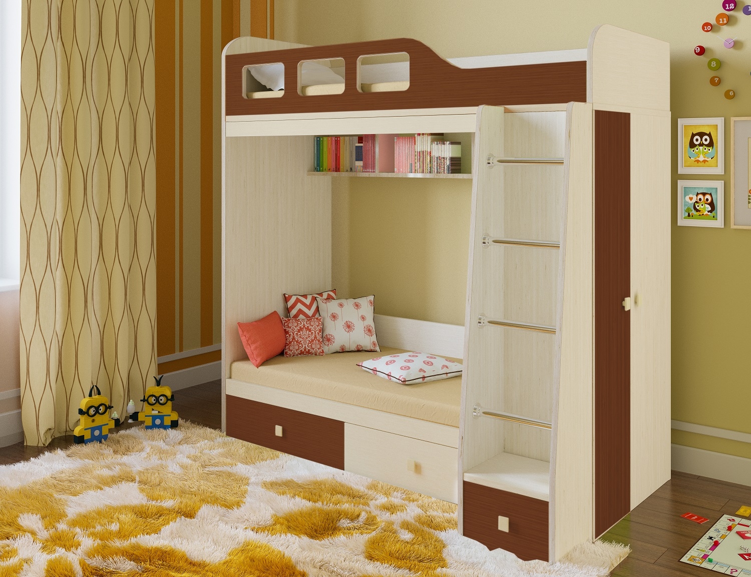 Двухъярусная кровать Астра 3 очень удобна, если в семье есть двое детей. Нижнее место немного меньше по размеру за счет встроенного бокового двустворчатого шкафа, в котором удобно хранить личные вещи обоих детей. Удобная и надежная лестница, расположенная с одного края, позволит без труда взобраться на верх. Выкатные ящики имеют достаточно места для хранения постельных принадлежностей или игрушек. Имеется также подвесная полочка для книг или различных детских безделушек. Цветовая гамма материала фасадов позволит создать уютную и веселую атмосферу в комнате ребенка.