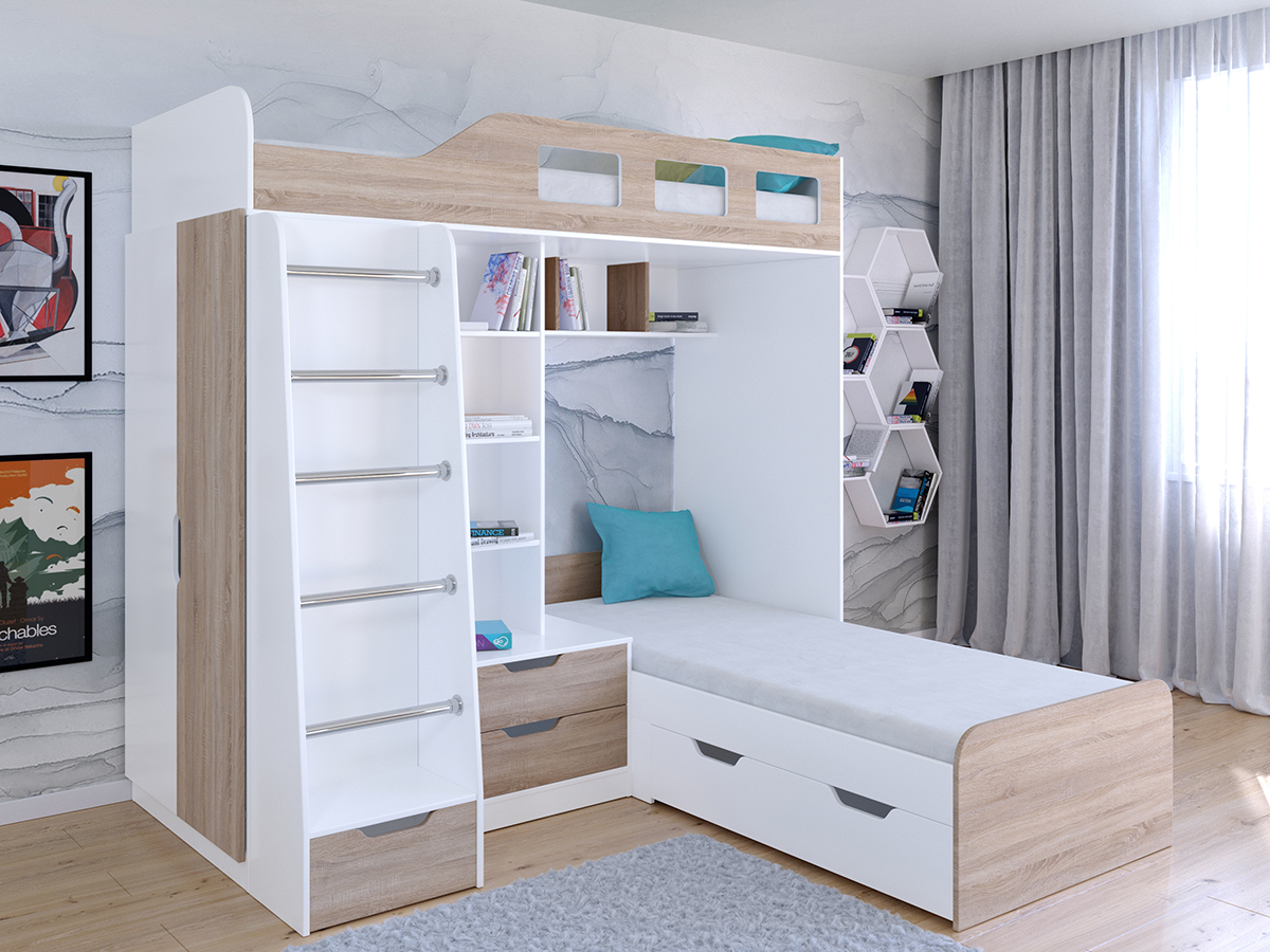 Двухъярусная кровать Астра 4 для двоих детей имеет необычную конфигурацию спальных мест. За счет этого она может быть гармонично расположена в углу комнаты. В изголовье расположились полочки для книг и игрушек. Рядом с нижней кроватью расположена удобная тумба с двумя ящиками, на которую можно поставить лампу для чтения. Нижняя кровать также снабжена вместительным выкатным ящиком для хранения игрушек или постельного белья. В боковой части всей конструкции есть встроенный шкаф для одежды.