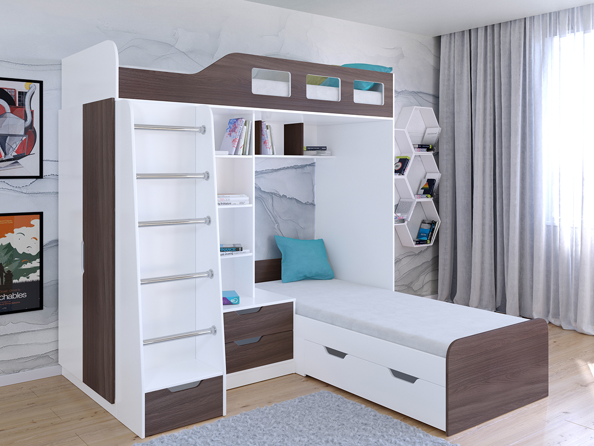 Двухъярусная кровать Астра 4 для двоих детей имеет необычную конфигурацию спальных мест. За счет этого она может быть гармонично расположена в углу комнаты. В изголовье расположились полочки для книг и игрушек. Рядом с нижней кроватью расположена удобная тумба с двумя ящиками, на которую можно поставить лампу для чтения. Нижняя кровать также снабжена вместительным выкатным ящиком для хранения игрушек или постельного белья. В боковой части всей конструкции есть встроенный шкаф для одежды.