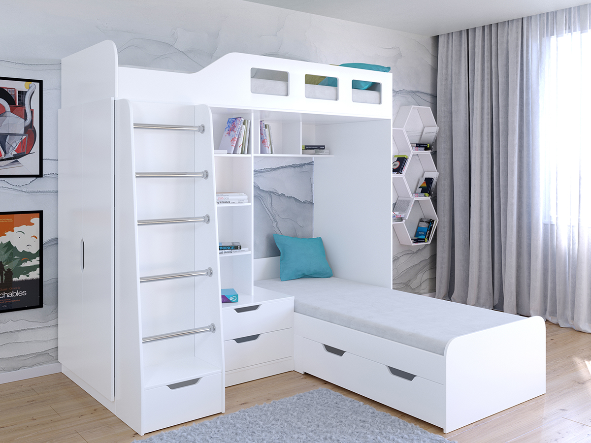 Двухъярусная кровать Астра 4 для двоих детей имеет необычную конфигурацию спальных мест. За счет этого она может быть гармонично расположена в углу комнаты. В изголовье расположились полочки для книг и игрушек. Рядом с нижней кроватью расположена удобная тумба с двумя ящиками, на которую можно поставить лампу для чтения. Нижняя кровать также снабжена вместительным выкатным ящиком для хранения игрушек или постельного белья. В боковой части всей конструкции есть встроенный шкаф для одежды.