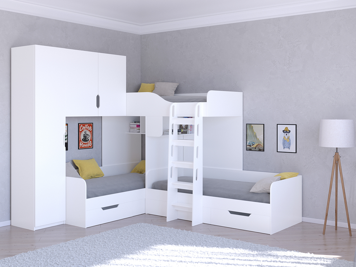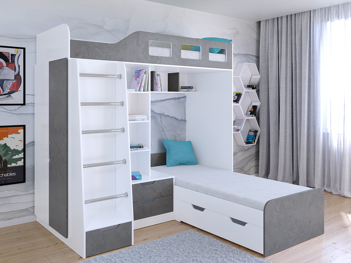 Двухъярусная кровать Астра 4 для двоих детей имеет необычную конфигурацию спальных мест. За счет этого она может быть гармонично расположена в углу комнаты. В изголовье расположились полочки для книг и игрушек. Рядом с нижней кроватью расположена удобная тумба с двумя ящиками, на которую можно поставить лампу для чтения. Нижняя кровать также снабжена вместительным выкатным ящиком для хранения игрушек или постельного белья. В боковой части всей конструкции есть встроенный шкаф для одежды.