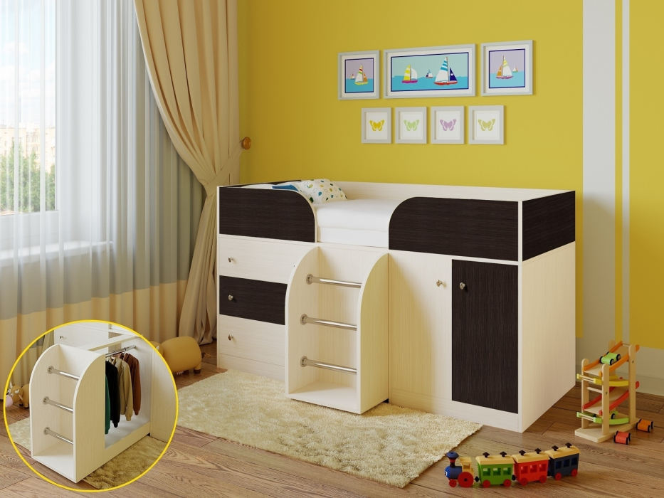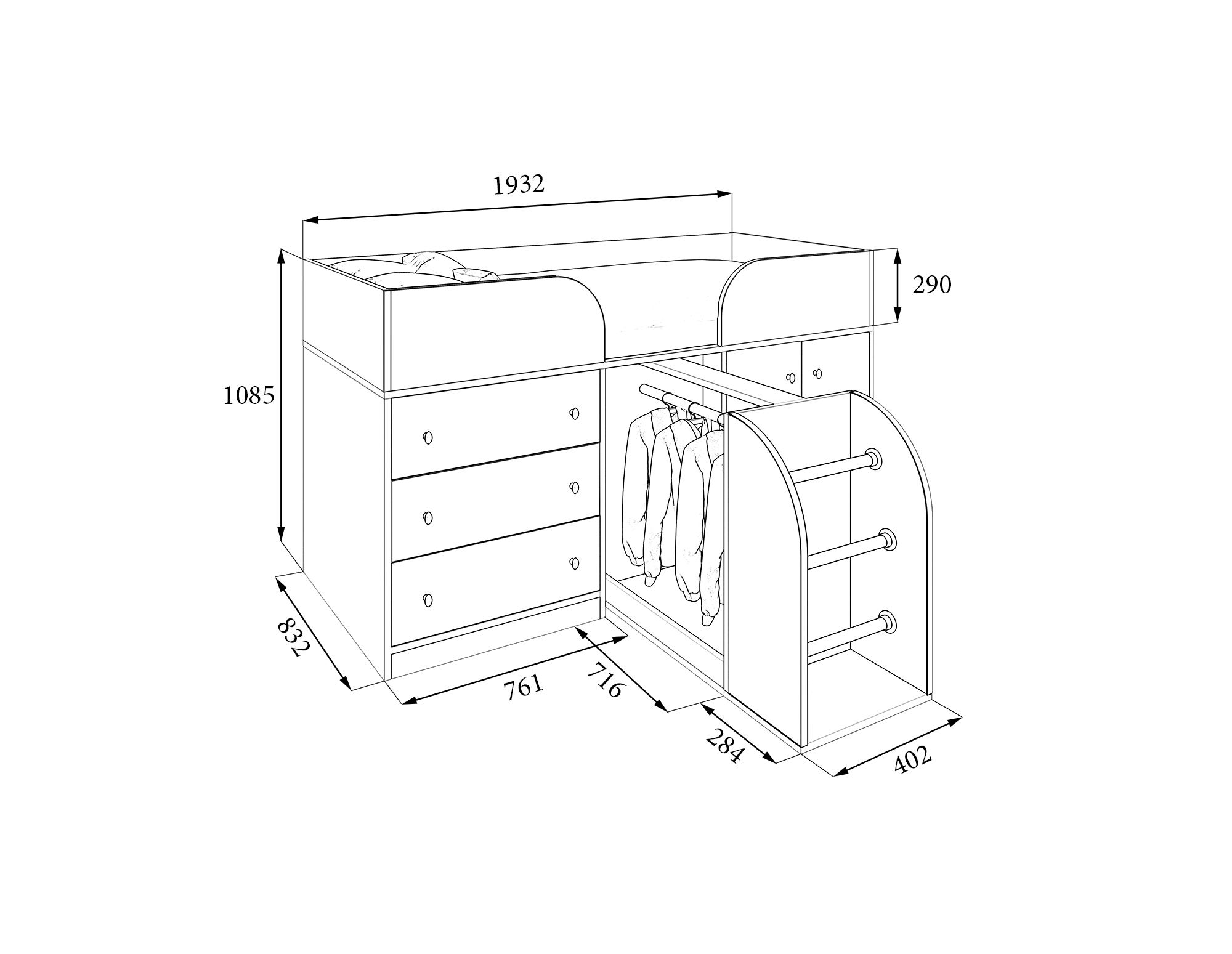 Кровать-чердак Астра 5 по своим габаритам занимает совсем небольшое пространство в комнате, но имеет хорошую вместимость. Спальное место ограждено высокими защитными бортиками со всех сторон. Попасть наверх можно по небольшой лестнице, внутри которой расположилось отделения для верхней одежды. Так же под кроватью расположены 3 выдвижных ящика и двустворчатый шкафчик с двумя полками.