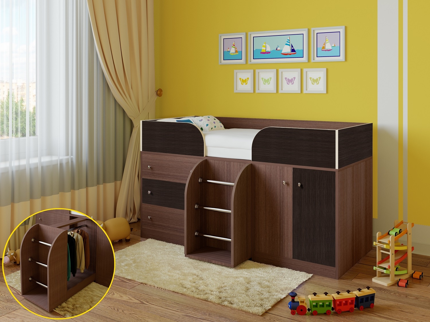 Кровать-чердак Астра 5 по своим габаритам занимает совсем небольшое пространство в комнате, но имеет хорошую вместимость. Спальное место ограждено высокими защитными бортиками со всех сторон. Попасть наверх можно по небольшой лестнице, внутри которой расположилось отделения для верхней одежды. Так же под кроватью расположены 3 выдвижных ящика и двустворчатый шкафчик с двумя полками.