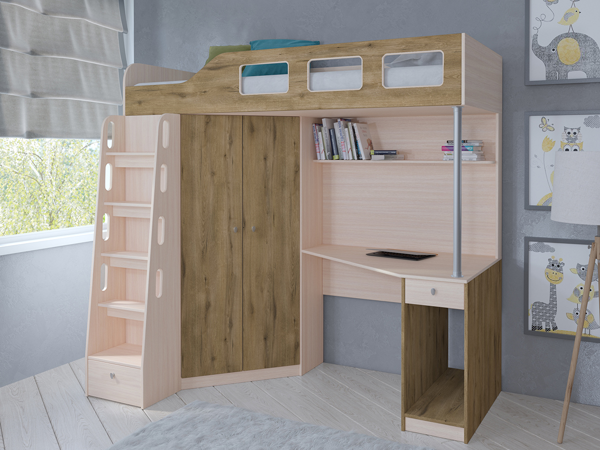 Кровать-чердак Астра 7 сочетает в себе полноценное спальное место с удобной рабочей зоной. Удобство доступа на верхний ярус обеспечивает удобная лестница с металлическими ступенями. В основании лестницы расположен ящик для детских принадлежностей. Рабочая зона располагает удобным столом, полкой для книг и местом для системного блока компьютера. Так же слева от стола расположен удобный, вместительный шкаф для одежды.