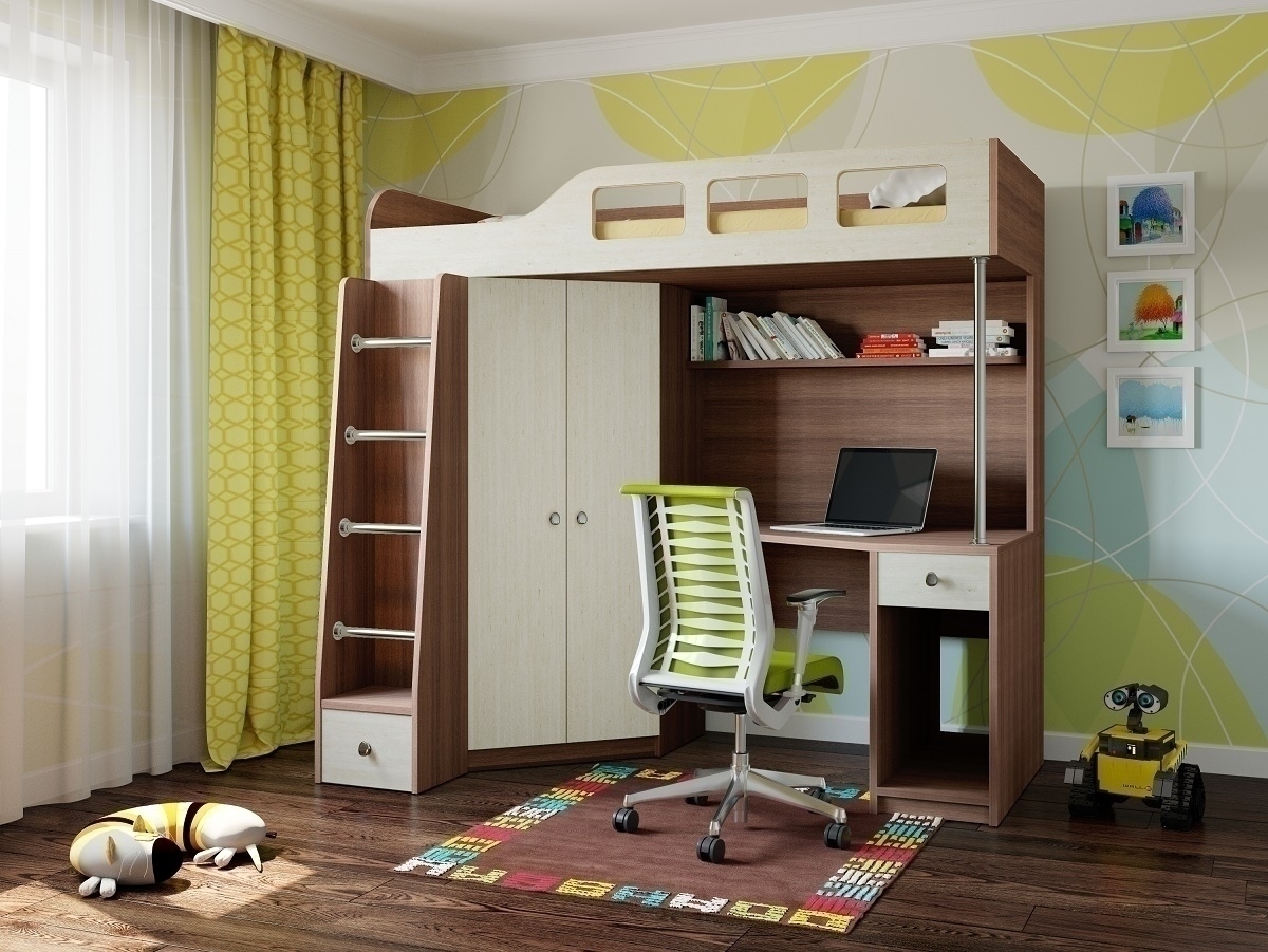 Кровать-чердак Астра 7 сочетает в себе полноценное спальное место с удобной рабочей зоной. Удобство доступа на верхний ярус обеспечивает удобная лестница с металлическими ступенями. В основании лестницы расположен ящик для детских принадлежностей. Рабочая зона располагает удобным столом, полкой для книг и местом для системного блока компьютера. Так же слева от стола расположен удобный, вместительный шкаф для одежды.