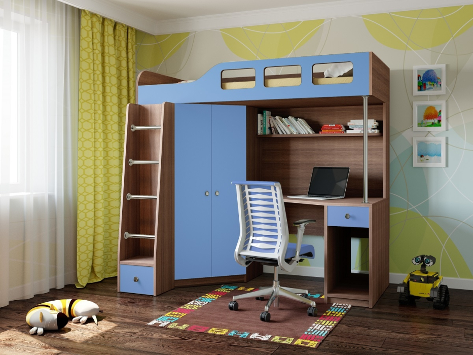 Кровать-чердак Астра 7 сочетает в себе полноценное спальное место с удобной рабочей зоной. Удобство доступа на верхний ярус обеспечивает удобная лестница с металлическими ступенями. В основании лестницы расположен ящик для детских принадлежностей. Рабочая зона располагает удобным столом, полкой для книг и местом для системного блока компьютера. Так же слева от стола расположен удобный, вместительный шкаф для одежды.
