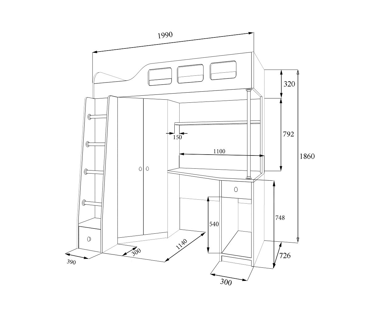 Кровать-чердак Астра 7 сочетает в себе полноценное спальное место с удобной рабочей зоной. Удобство доступа на верхний ярус обеспечивает удобная лестница с металлическими ступенями. В основании лестницы расположен ящик для детских принадлежностей. Рабочая зона располагает удобным столом, полкой для книг и местом для системного блока компьютера. Так же слева от стола расположен удобный, вместительный шкаф для одежды.