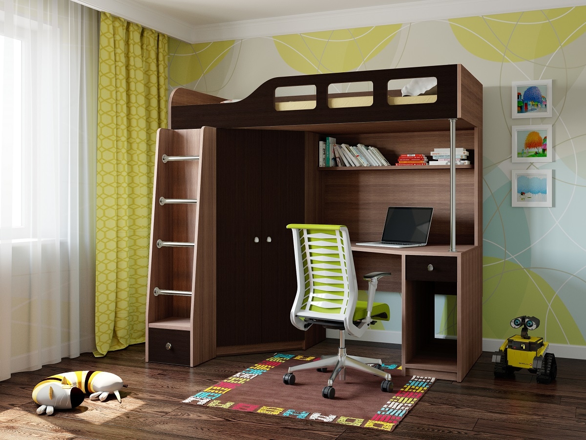 Кровать-чердак Астра 7 сочетает в себе полноценное спальное место с удобной рабочей зоной. Удобство доступа на верхний ярус обеспечивает удобная лестница с металлическими ступенями. В основании лестницы расположен ящик для детских принадлежностей. Рабочая зона располагает удобным столом, полкой для книг и местом для системного блока компьютера. Так же слева от стола расположен удобный, вместительный шкаф для одежды.