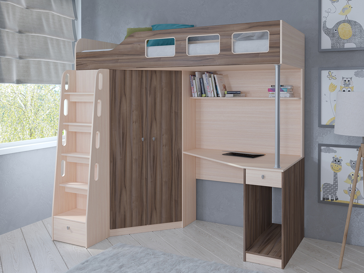 Кровать-чердак Астра 7 сочетает в себе полноценное спальное место с удобной рабочей зоной. Удобство доступа на верхний ярус обеспечивает удобная лестница с металлическими ступенями. В основании лестницы расположен ящик для детских принадлежностей. Рабочая зона располагает удобным столом, полкой для книг и местом для системного блока компьютера. Так же слева от стола расположен удобный, вместительный шкаф для одежды.