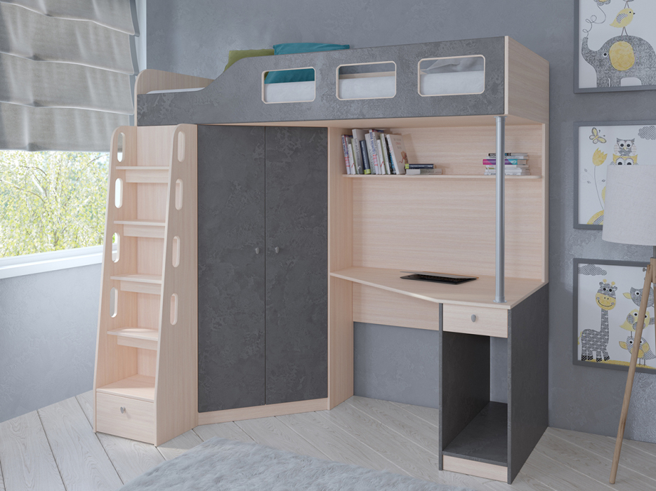 Кровать-чердак Астра 7 сочетает в себе полноценное спальное место с удобной рабочей зоной. Удобство доступа на верхний ярус обеспечивает удобная лестница с металлическими ступенями. В основании лестницы расположен ящик для детских принадлежностей. Рабочая зона располагает удобным столом, полкой для книг и местом для системного блока компьютера. Так же слева от стола расположен удобный, вместительный шкаф для одежды.