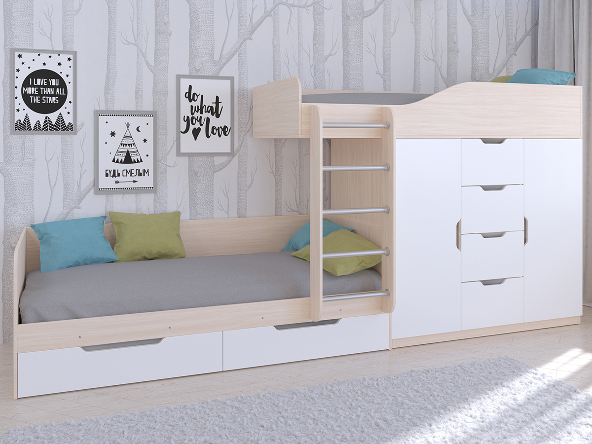 Двухъярусная кровать Астра 6 имеет не стандартную конструкцию - два спальным места расположены в одной плоскости, но со смещением. Такое инженерное решение позволило разместить в кровати большой, вместительный шкаф. Безопасно забраться на верхний ярус позволит удобная лестница с металлическими ступенями. Постельное белье или любые вещи можно разместить в двух ящиках, расположенных под нижним ярусом.