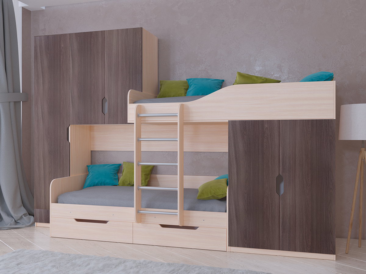 Двухъярусная кровать Лео представляет из себя полноценный комплект для детской комнаты. Два полноценных спальных места помогут хорошо выспаться и набраться сил. Удобный доступ к верхнему ярусу обеспечивается за счет надежной лестницы с металлическими ступенями. Развитая система хранения вещей данной кровати позволит разместить в своих недрах все необходимые вещи. Постельное белье с легкостью поместиться в ящики, расположенные под нижним ярусом. Так же кровать располагает платяным шкафом, высокой колонкой с полками и вместительной антресолью.