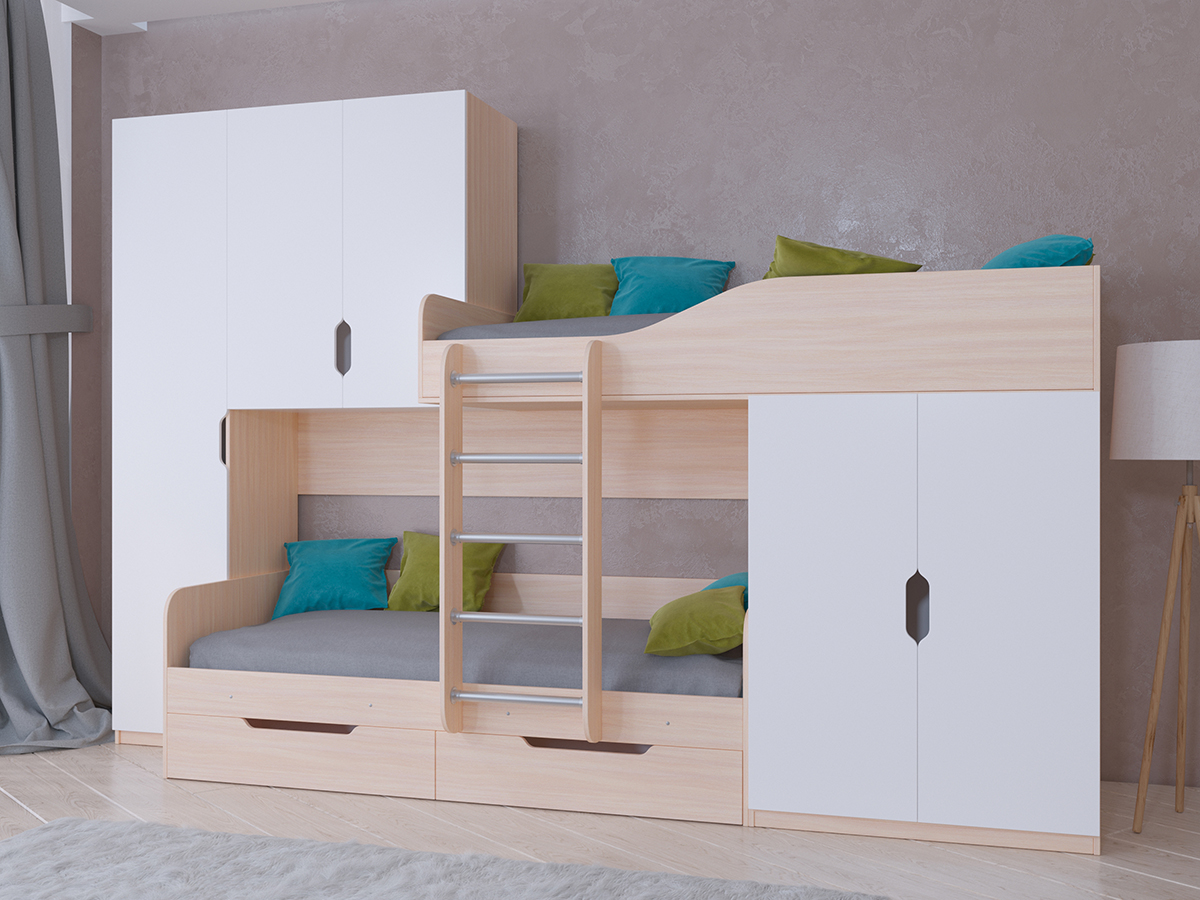 Двухъярусная кровать Лео представляет из себя полноценный комплект для детской комнаты. Два полноценных спальных места помогут хорошо выспаться и набраться сил. Удобный доступ к верхнему ярусу обеспечивается за счет надежной лестницы с металлическими ступенями. Развитая система хранения вещей данной кровати позволит разместить в своих недрах все необходимые вещи. Постельное белье с легкостью поместиться в ящики, расположенные под нижним ярусом. Так же кровать располагает платяным шкафом, высокой колонкой с полками и вместительной антресолью.