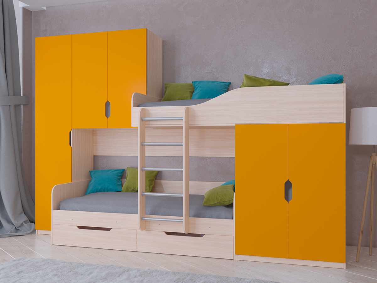 Двухъярусная кровать Лео представляет из себя полноценный комплект для детской комнаты. Два полноценных спальных места помогут хорошо выспаться и набраться сил. Удобный доступ к верхнему ярусу обеспечивается за счет надежной лестницы с металлическими ступенями. Развитая система хранения вещей данной кровати позволит разместить в своих недрах все необходимые вещи. Постельное белье с легкостью поместиться в ящики, расположенные под нижним ярусом. Так же кровать располагает платяным шкафом, высокой колонкой с полками и вместительной антресолью.