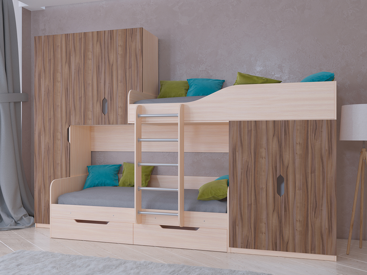 Двухъярусная кровать Лео представляет из себя полноценный комплект для детской комнаты. Два полноценных спальных места помогут хорошо выспаться и набраться сил. Удобный доступ к верхнему ярусу обеспечивается за счет надежной лестницы с металлическими ступенями. Развитая система хранения вещей данной кровати позволит разместить в своих недрах все необходимые вещи. Постельное белье с легкостью поместиться в ящики, расположенные под нижним ярусом. Так же кровать располагает платяным шкафом, высокой колонкой с полками и вместительной антресолью.