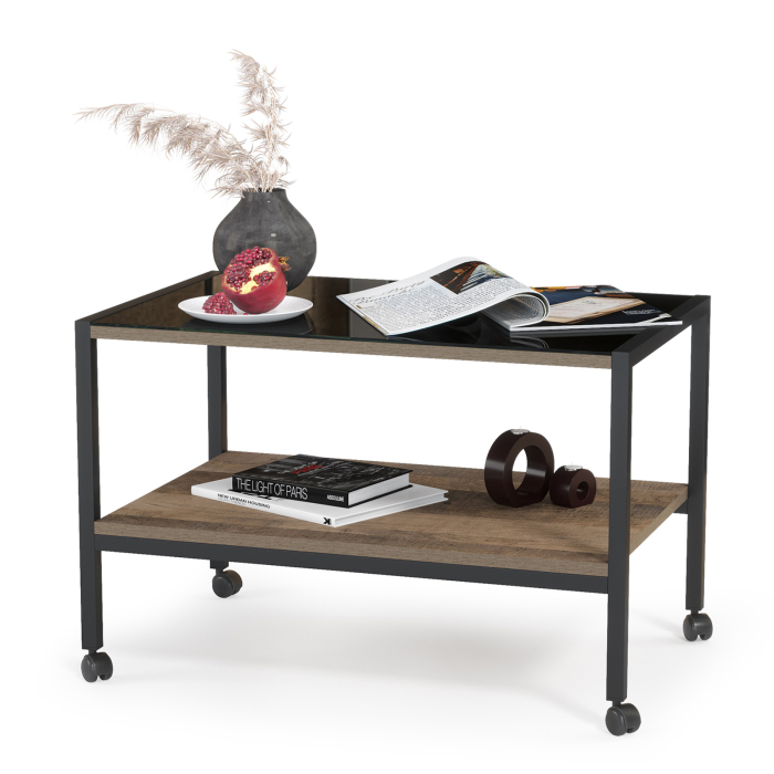 Компактный журнальный столик с прямойгольной столешницей и нижней полкой. На столещнице имется накладка из тонированного стекла. Стол журнальный Трувор 12.19 установлен на колесные опоры, которые придают ему желанную мобильность. Металлические стойки с колесными опорами делают столик надёжным, аутентичным и функциональным. Выполнена мебель из ламинированной ДСП 16 мм, торцы окромлены ПХВ плёнкой 0,4 мм. В производстве мебели использована современная фурнитура, отличающаяся высокой надёжностью и долговечностью. Поставляется в разобранном виде в надёжной упаковке, с комплектом сборочной фурнитуры и инструкцией по сборке.