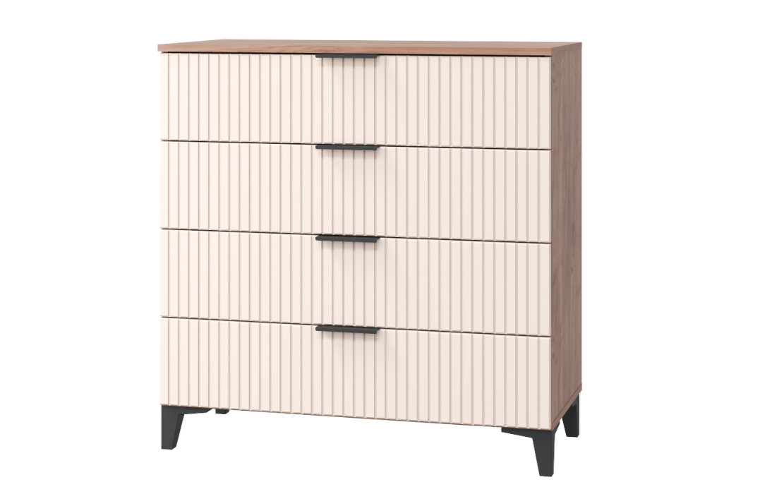 Корпус выполнен в древесном декоре "дуб табачный" с рисунком, имитирующим текстуру натурального дерева. Фасад четырех ящиков изготовлен из МДФ в декоре "бисквит".
