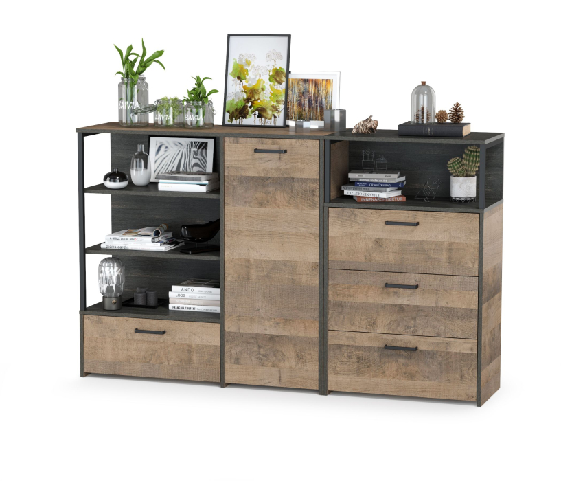Брутальный декор и контрастная кромка, как и лицевая фурнитура придаёт мебели индустриальную эстетику. Комплектация представляет из себя вместительную систему хранения из двух комодов Трувор 13.307.01 и Трувор 13.307.02. Аккуратный комод Трувор 13.307.02 оснащен 3 выдвижными ящиками и открытой нишей сверху. Вместительный комод Трувор 13.307.01 оснащен 2 полками за распашной дверкой с одной стороны и 3 открытыми нишами и выдвижным ящиком снизу с другой. Комод 13.307.01 имеет универсальную сборку, что позволяет расположить дверку как справа, так и слева. Направляющие выдвижных ящиков скрытого монтажа оснащены доводчиками, что обеспечивают повышенный комфорт и надёжность. На нижних кромках опор комодов предусмотрены пластиковые подпятники для защиты поверхности пола от механических повреждений. Металлические элементы делают эту мебель надёжной, аутентичной и функциональной. Выполнена мебель из ламинированной ДСП 16 мм и металлических элементов, торцы окромлены ПХВ плёнкой 0,4 мм. В производстве мебели использована современная фурнитура, отличающаяся высокой надёжностью и долговечностью. Поставляется в разобранном виде в надёжной упаковке, с комплектом сборочной фурнитуры и инструкцией по сборке.