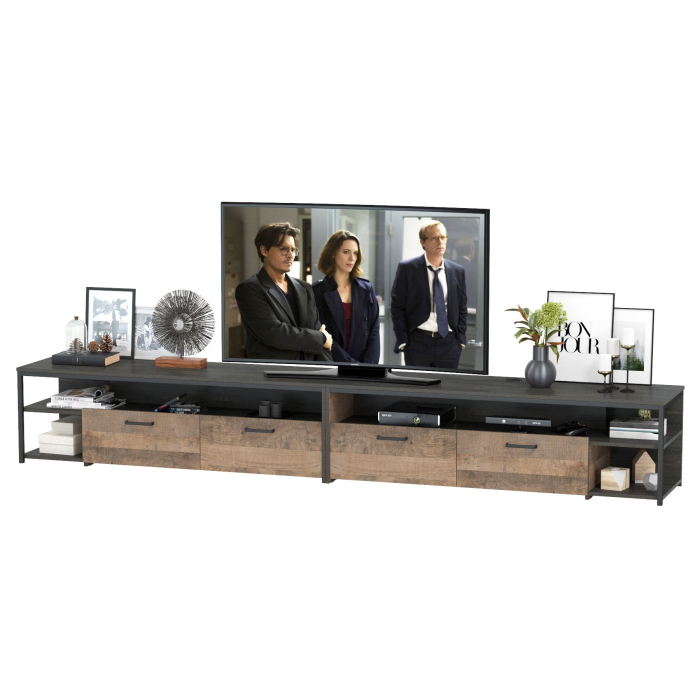 Брутальный декор и контрастная кромка, как и лицевая фурнитура придаёт мебели индустриальную эстетику. Конструктивно представляет из себя две тумбы ТВ, объединенные в широкую низкую тумбу. Каждая тумба оснащена широкой нишей сверху и 2 выдвижными ящиками и небольшой нишей снизу. Столешница тумбы имеет по центру кабель-канал, что значительно упрощает подключение техники и проблемы с проводами. Направляющие выдвижных ящиков скрытого монтажа оснащены доводчиками, что обеспечивают повышенный комфорт и надёжность. На нижних кромках опор тумбы предусмотрены пластиковые подпятники для защиты поверхности пола от механических повреждений. Тумба под ТВ Трувор 13.70 имеет универсальную сборку, что позволяет расположить ящики как справа, так и слева. Металлические элементы делают этот стол надёжным, аутентичнымй и функциональным. Выполнена мебель из ламинированной ДСП 16 мм и металлических элементов, торцы окромлены ПХВ плёнкой 0,4 мм. В производстве мебели использована современная фурнитура, отличающаяся высокой надёжностью и долговечностью. Поставляется в разобранном виде в надёжной упаковке, с комплектом сборочной фурнитуры и инструкцией по сборке.