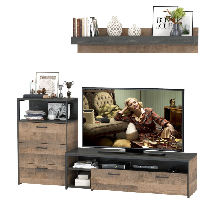 Брутальный декор и контрастная кромка, как и лицевая фурнитура придаёт мебели индустриальную эстетику. Комплектация состоит из тумбы под ТВ Трувор 13.70, комода Трувор 13.307.02 и полки навесной Трувор 15.60. Тумба оснащена широкой нишей сверху и 2 выдвижными ящиками и небольшой нишей снизу. Столешница тумбы имеет по центру кабель-канал, что значительно упрощает подключение техники и проблемы с проводами. На нижних кромках опор тумбы предусмотрены пластиковые подпятники для защиты поверхности пола от механических повреждений. Тумба под ТВ Трувор 13.70 имеет универсальную сборку, что позволяет расположить ящики как справа, так и слева. Вместительный и аккуратный комод оснащен 3 выдвижными ящиками и открытой нишей сверху. На нижних кромках опор комода предусмотрены пластиковые подпятники для защиты поверхности пола от механических повреждений. Металлические элементы делают эту мебель надёжной, аутентичной и функциональной. Классическая навесная открытая полка с задней панелью расположена над тумбой. Полка располагается по центру панели и оборудована бортиком. Полку Трувор 15.60 можно использовать как книжную, а также для размещения элементов декора, поделок и фотографий. Полка имеет с обратной стороны панели скрытые крепленния. Максимальная нагрузка на полку составляет 3 кг. Направляющие выдвижных ящиков скрытого монтажа оснащены доводчиками, что обеспечивают повышенный комфорт и надёжность. Выполнена мебель из ламинированной ДСП 16 мм и металлических элементов, торцы окромлены ПХВ плёнкой 0,4 мм. В производстве мебели использована современная фурнитура, отличающаяся высокой надёжностью и долговечностью. Поставляется в разобранном виде в надёжной упаковке, с комплектом сборочной фурнитуры и инструкцией по сборке.